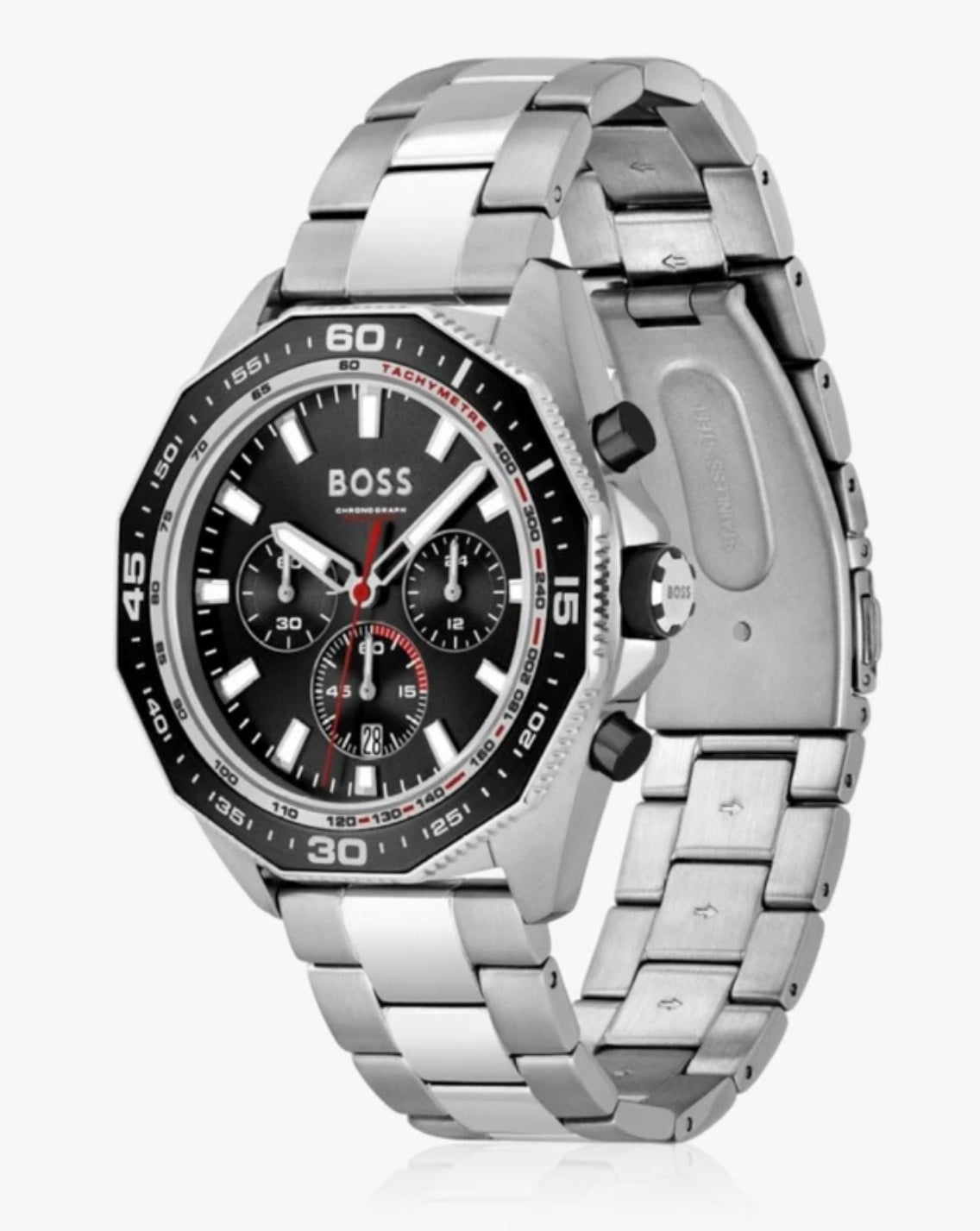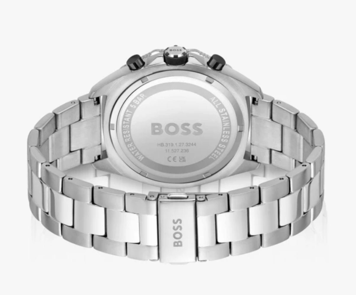 • Case & Bracelet: Stainless steel case with a brushed steel bracelet in a three-link design.