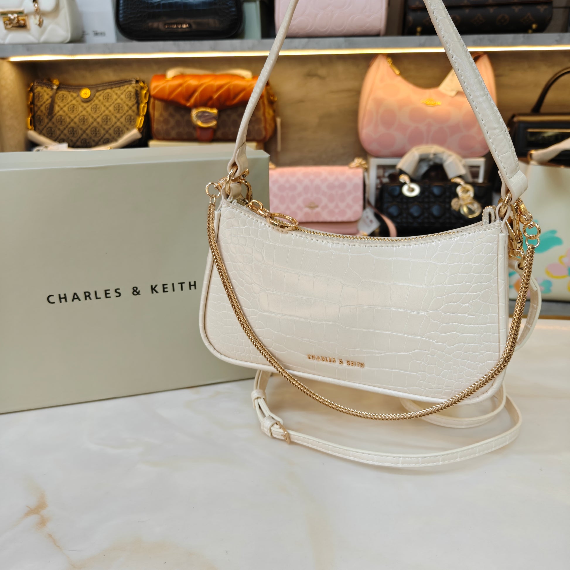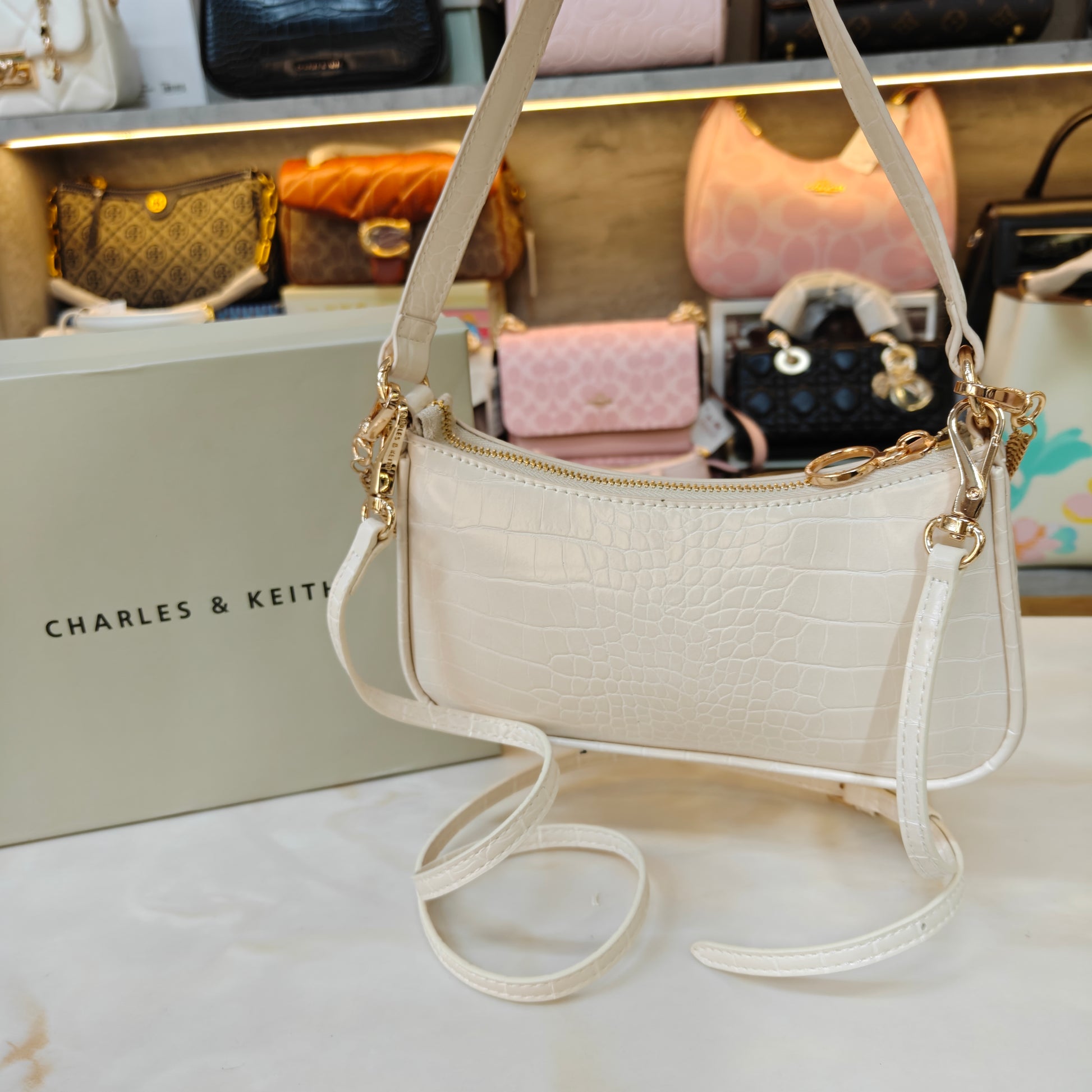 This elegant shoulder bag features a sleek cream faux-crocodile texture, giving it a sophisticated and modern appeal. The gold-tone chain detail and hardware add a touch of luxury, while the clean silhouette enhances its chic design. It comes with both a short handle and a detachable adjustable strap, offering versatile styling options. Compact yet practical, this piece is perfect for elevating both casual and dressy looks.
