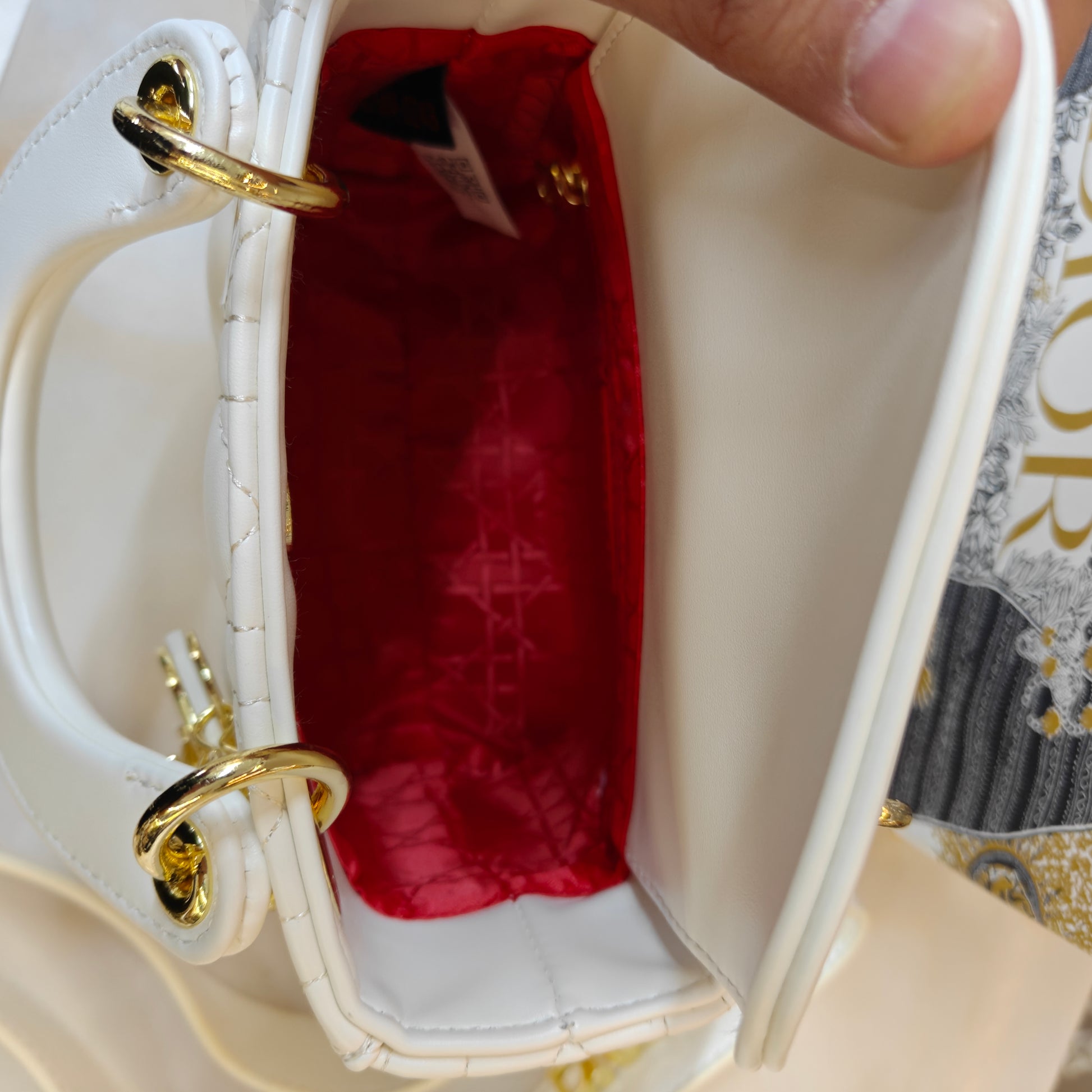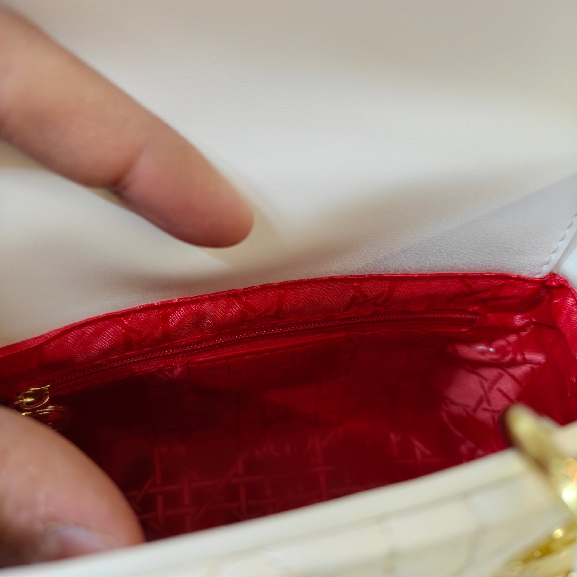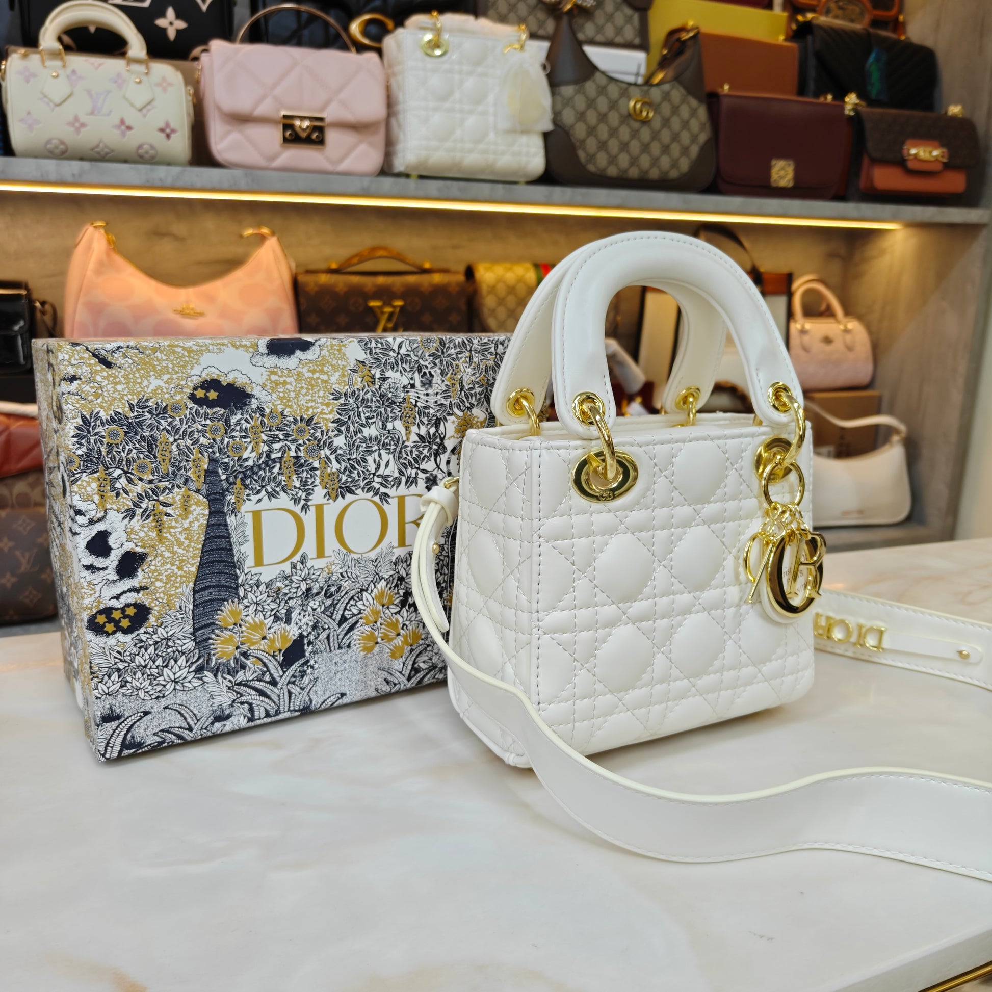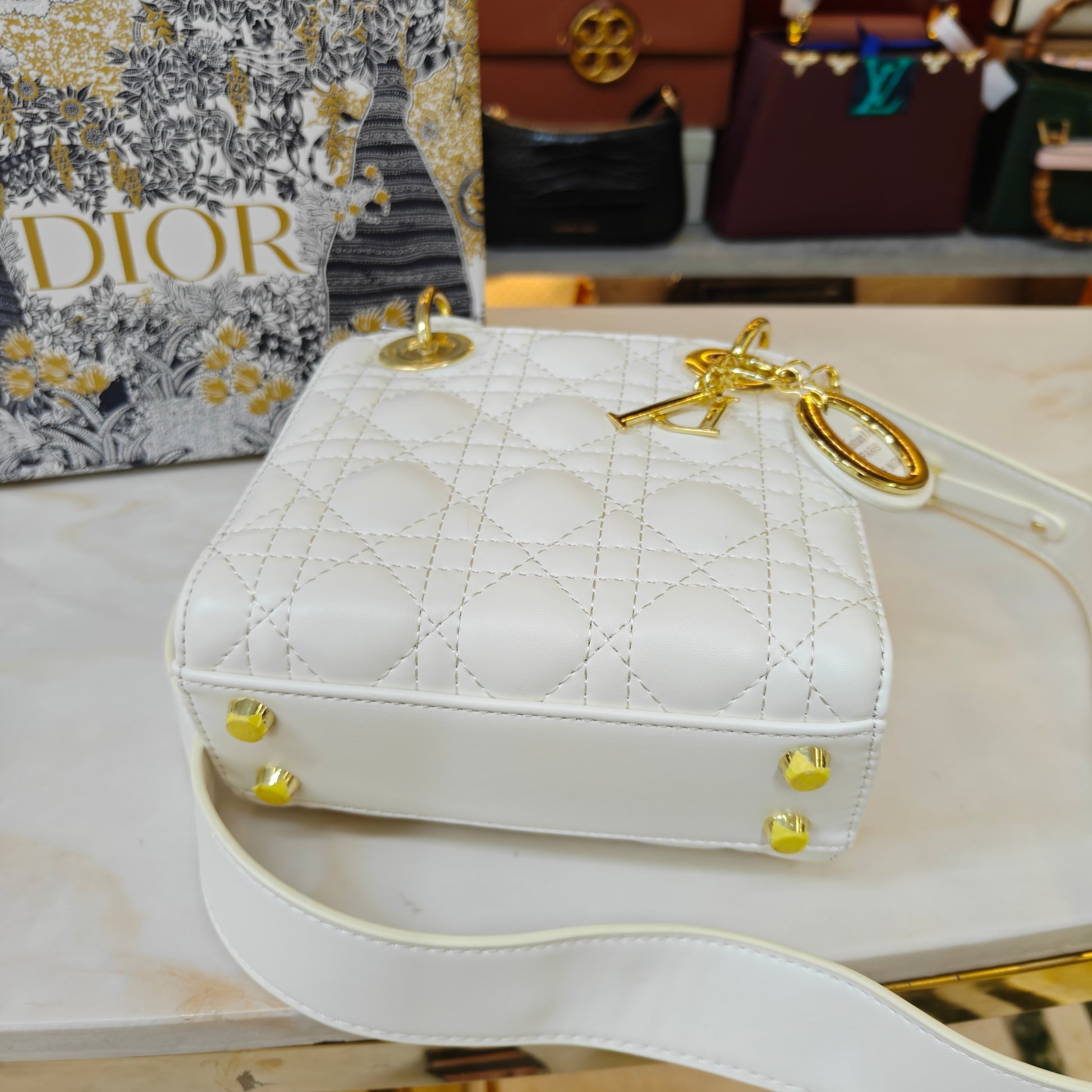 This chic mini top-handle bag features a structured boxy silhouette crafted from white quilted material for a timeless and elegant look. It’s detailed with polished gold-tone hardware, including eyelet attachments and dangling charm accents that add a touch of luxury. The bag comes with a detachable, adjustable strap for versatile styling—perfect for both hand-carry and crossbody wear. Compact yet statement-making, it’s an ideal piece to elevate any outfit with refined sophistication.