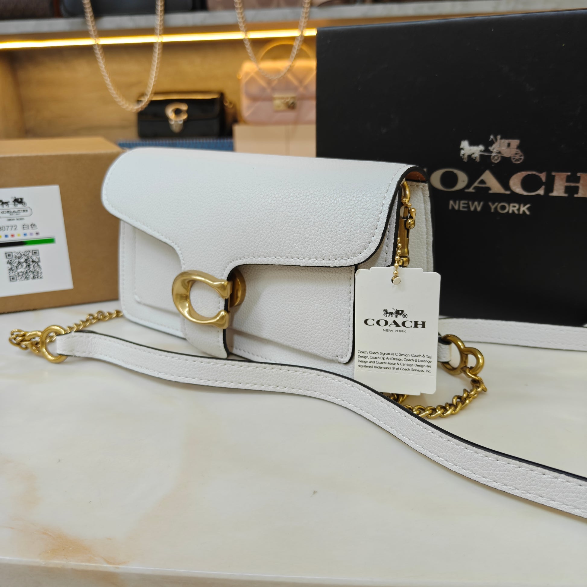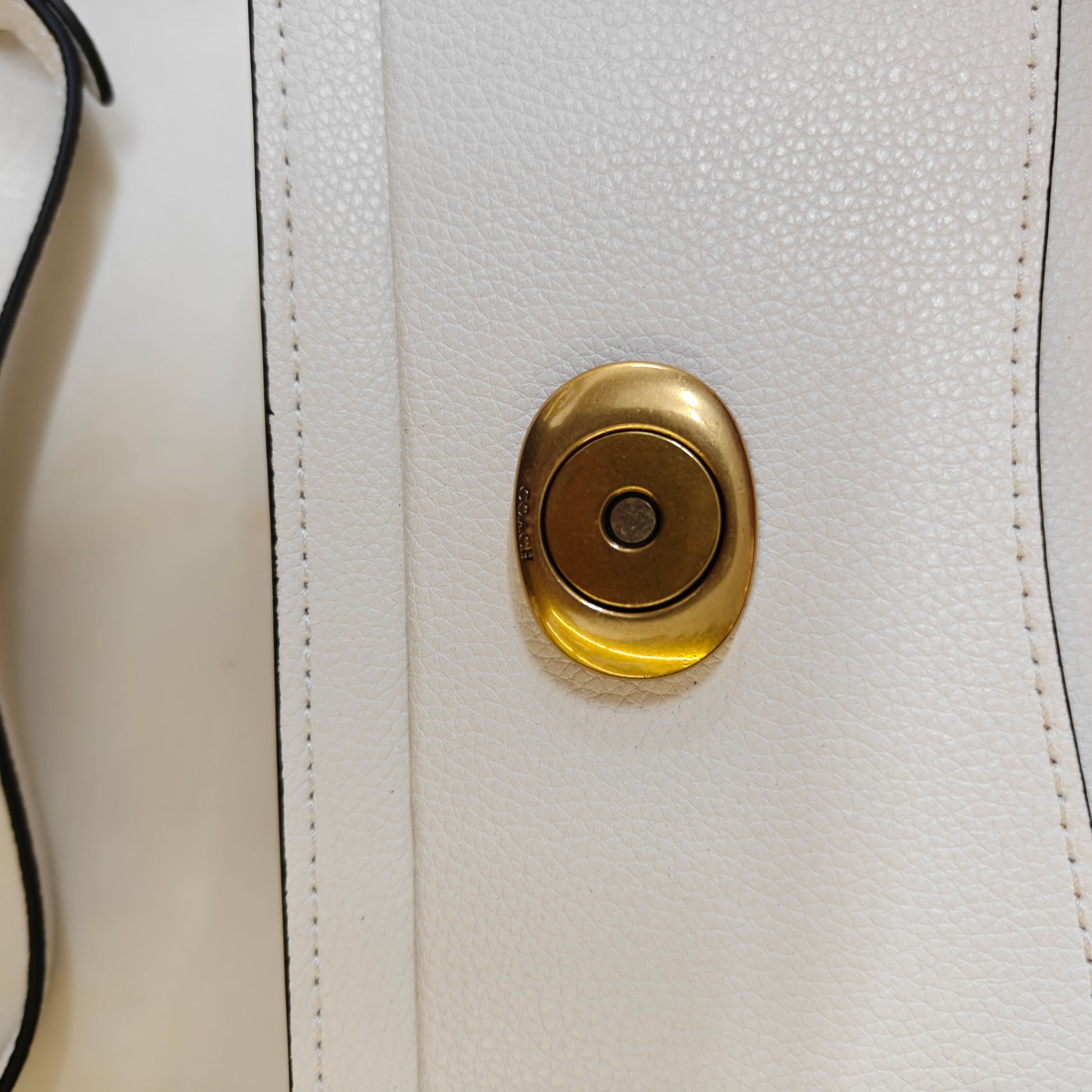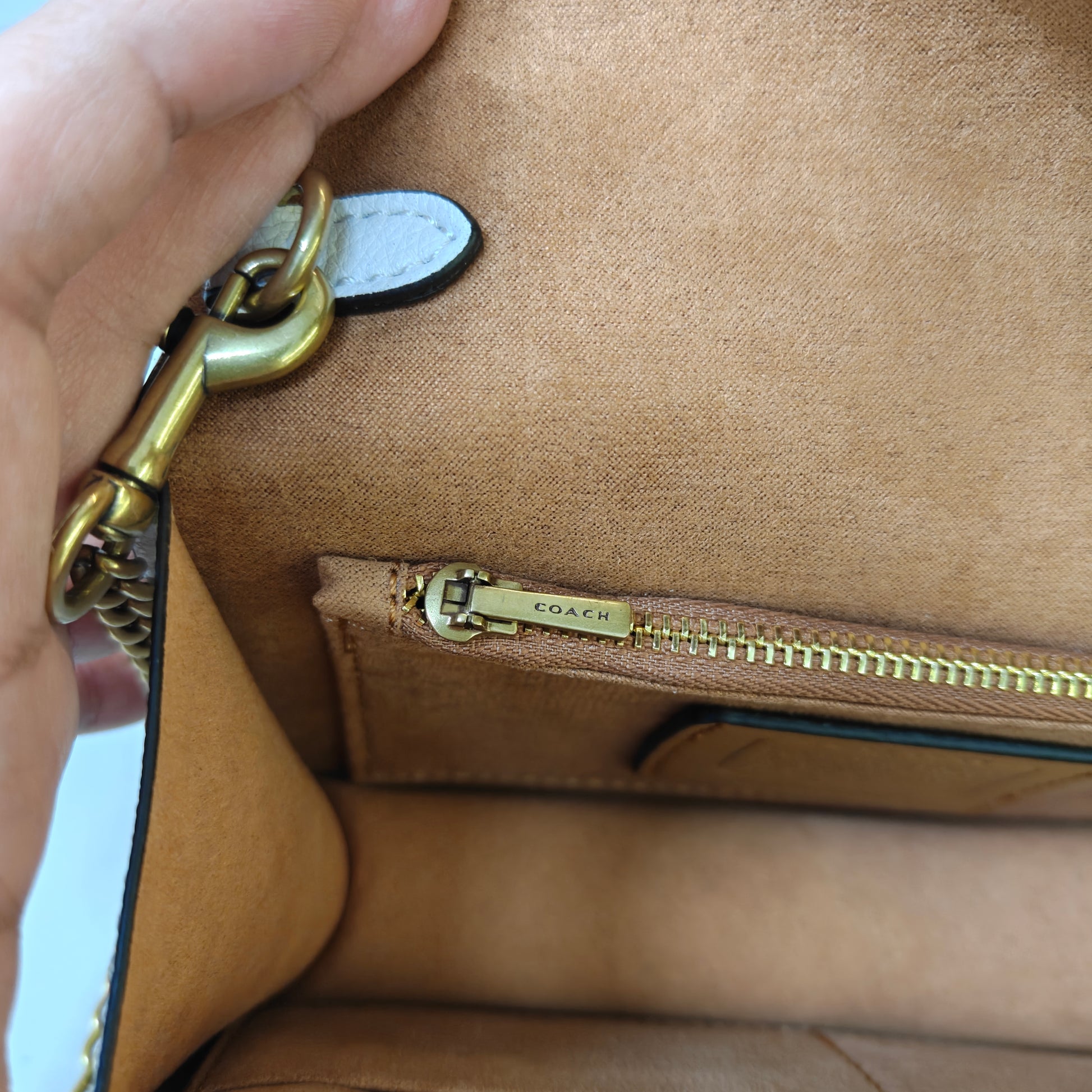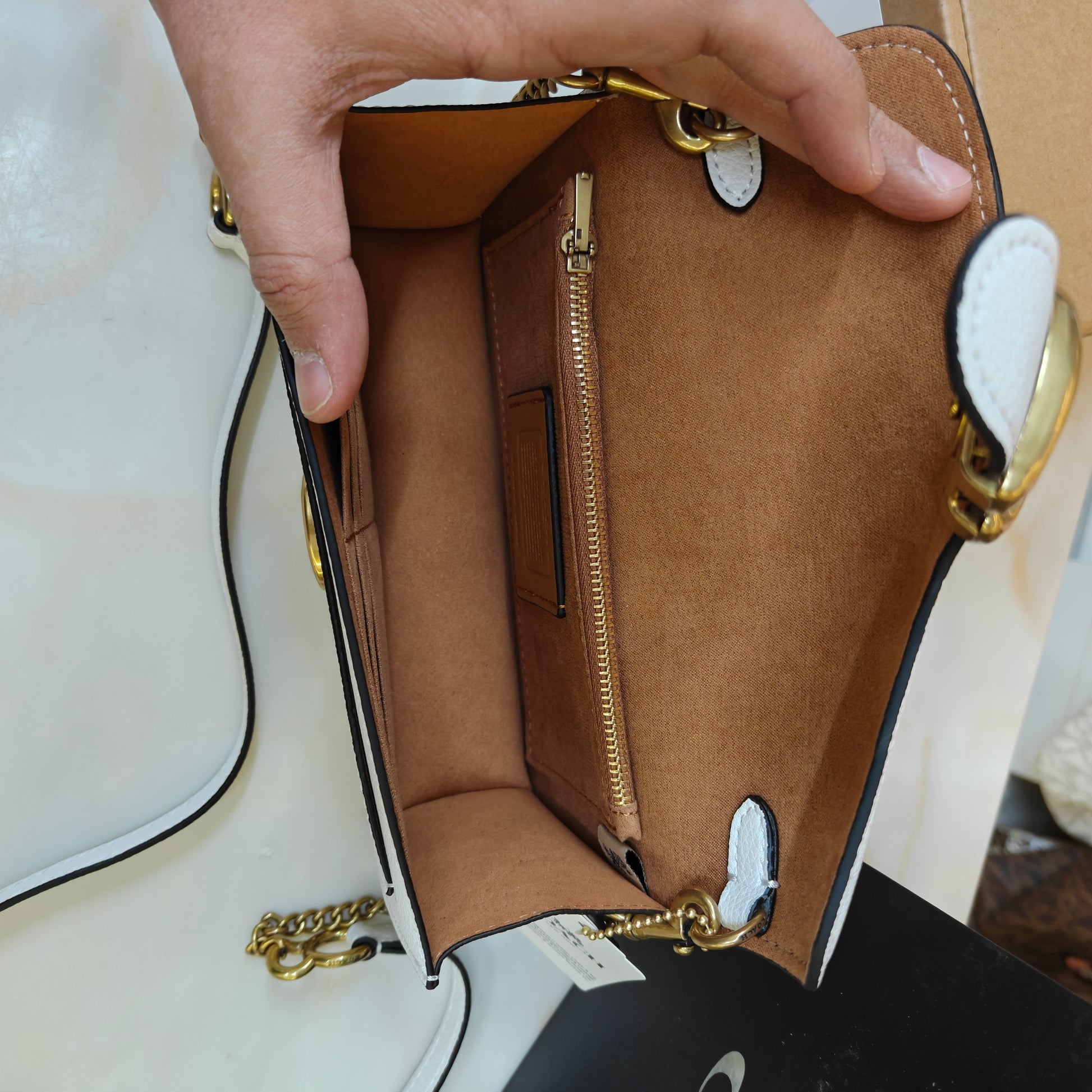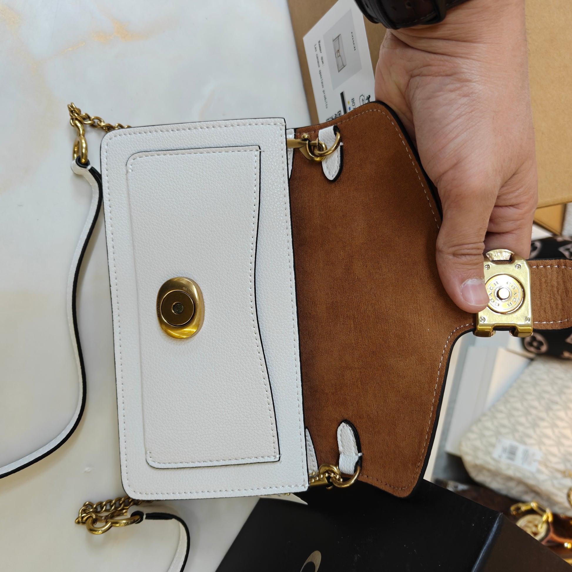 This elegant crossbody bag features a structured design crafted in smooth white leather for a clean, timeless look. It’s accented with a gold-tone chain and leather strap, offering both style and versatility for shoulder or crossbody wear. The front flap is finished with a bold metallic “C” detail, adding a touch of sophistication. Compact yet functional, this bag is perfect for carrying your daily essentials while elevating any outfit with its modern, polished aesthetic.