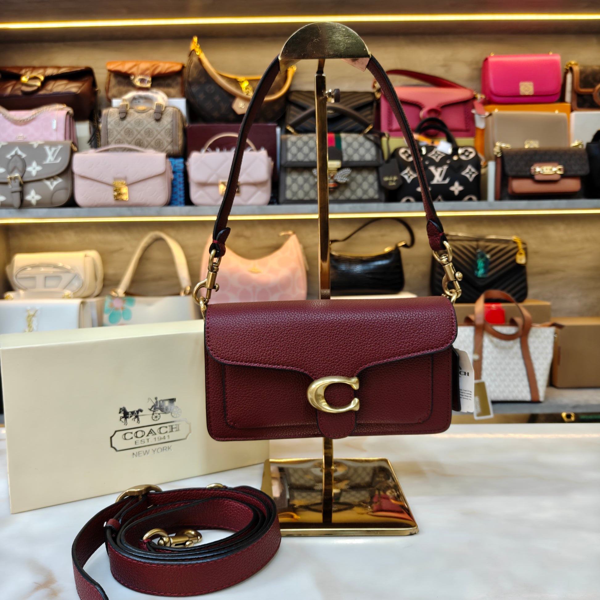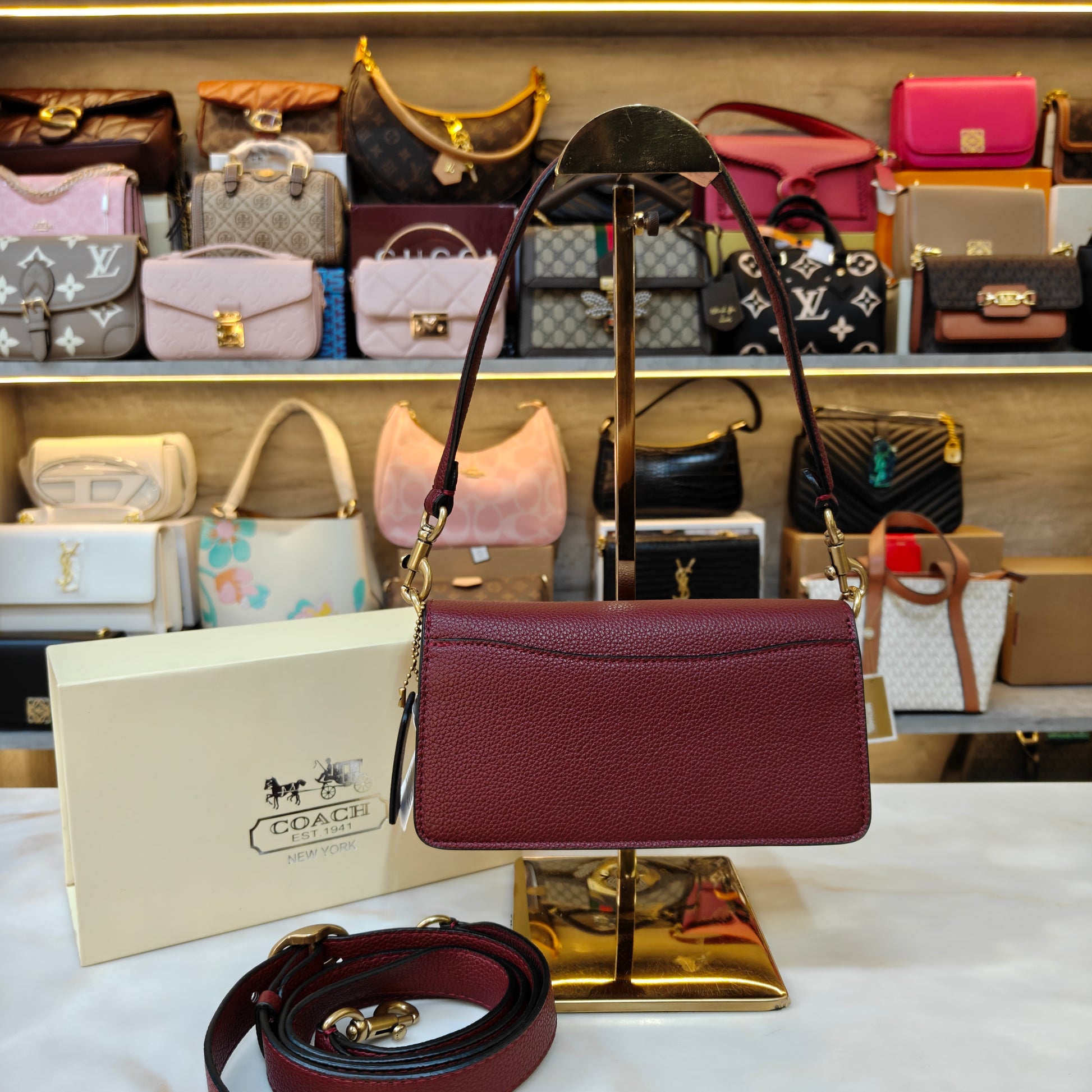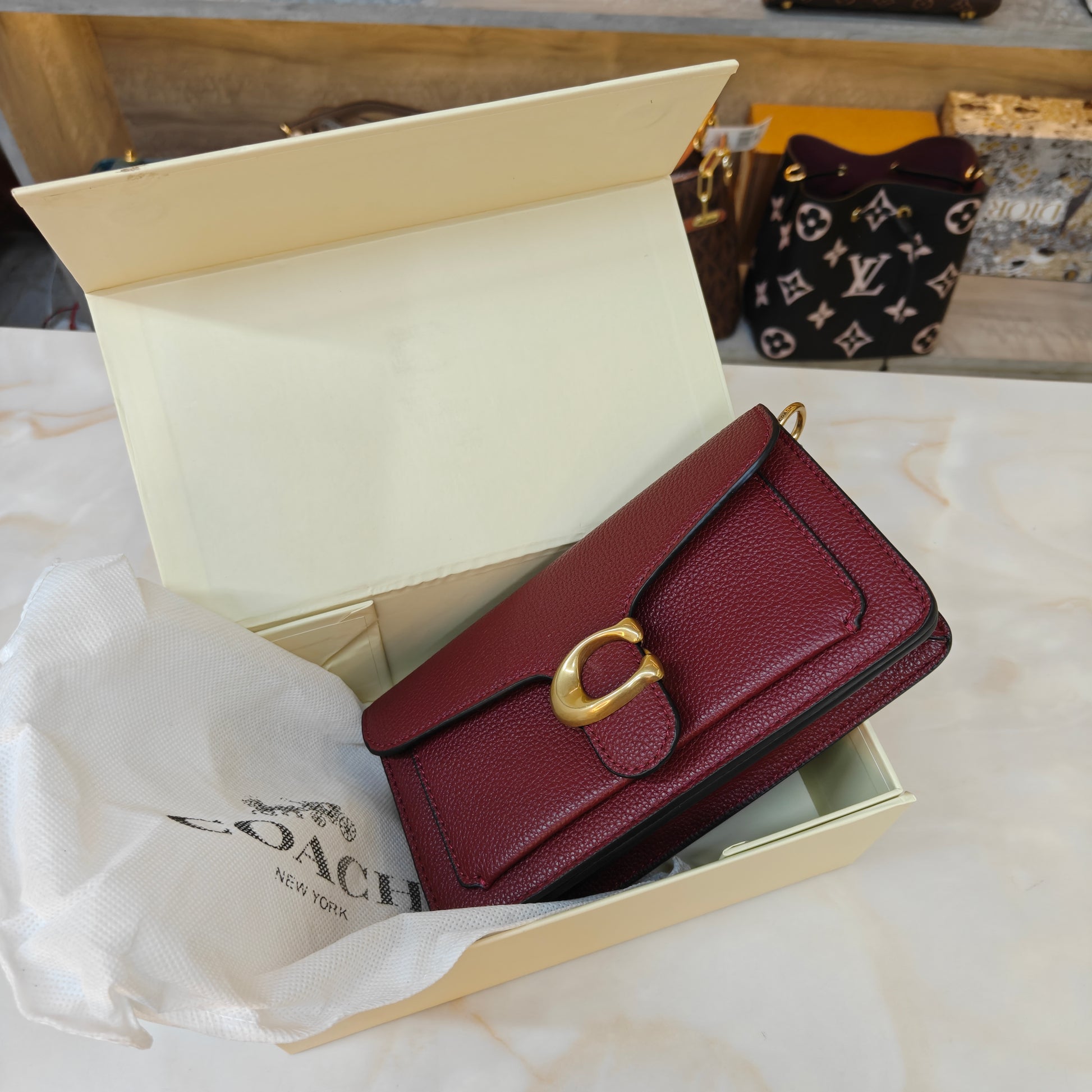 This elegant crossbody bag showcases a structured silhouette crafted from premium pebbled leather, offering both sophistication and durability. The design features a flap closure with a bold metallic accent that adds a refined touch. It comes with both a short handle and a detachable long strap, allowing for versatile styling as a shoulder or crossbody bag. Compact yet practical, this piece is perfect for carrying your essentials in timeless style, ideal for both day and evening wear.
