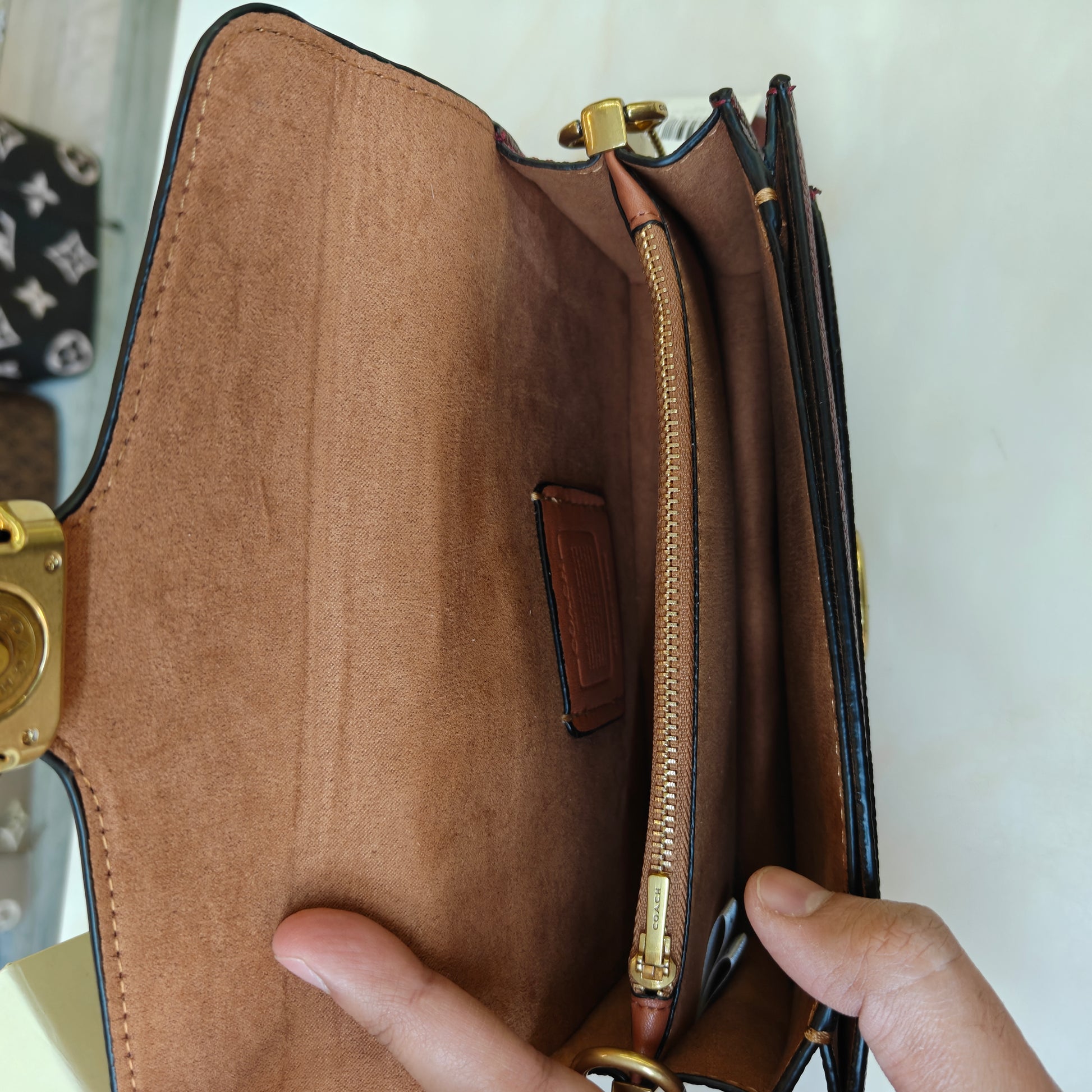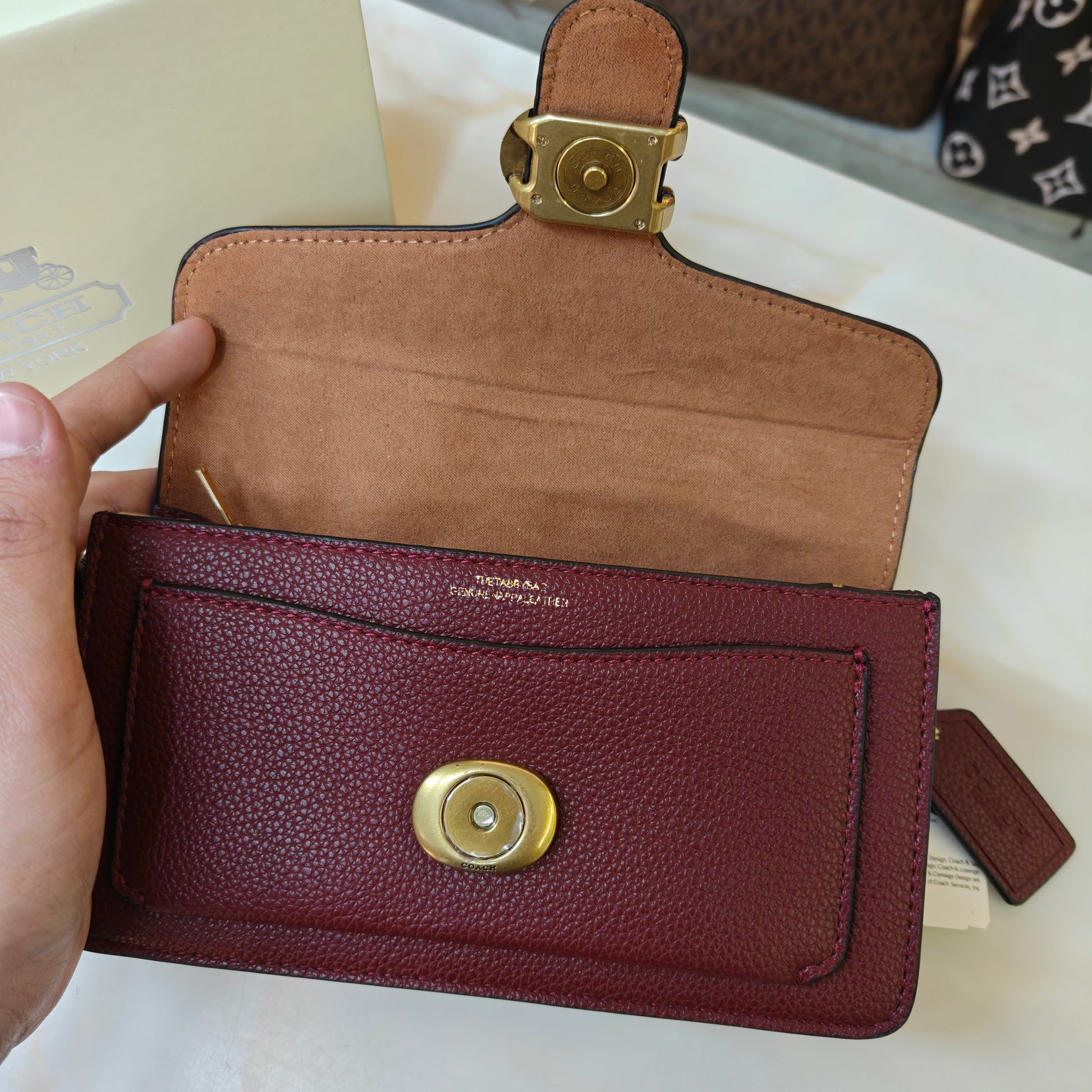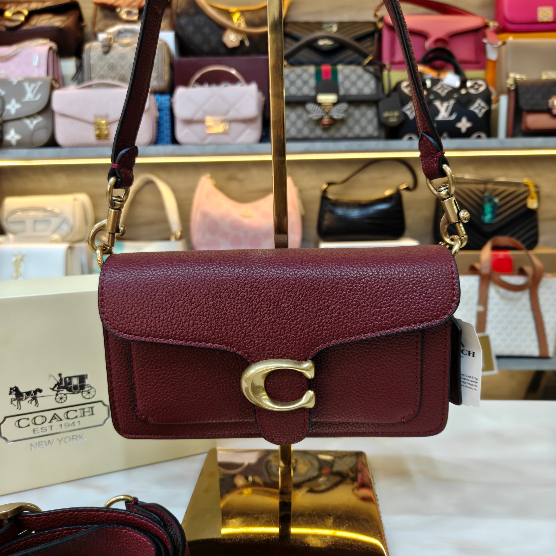 This elegant crossbody bag showcases a structured silhouette crafted from premium pebbled leather, offering both sophistication and durability. The design features a flap closure with a bold metallic accent that adds a refined touch. It comes with both a short handle and a detachable long strap, allowing for versatile styling as a shoulder or crossbody bag. Compact yet practical, this piece is perfect for carrying your essentials in timeless style, ideal for both day and evening wear.