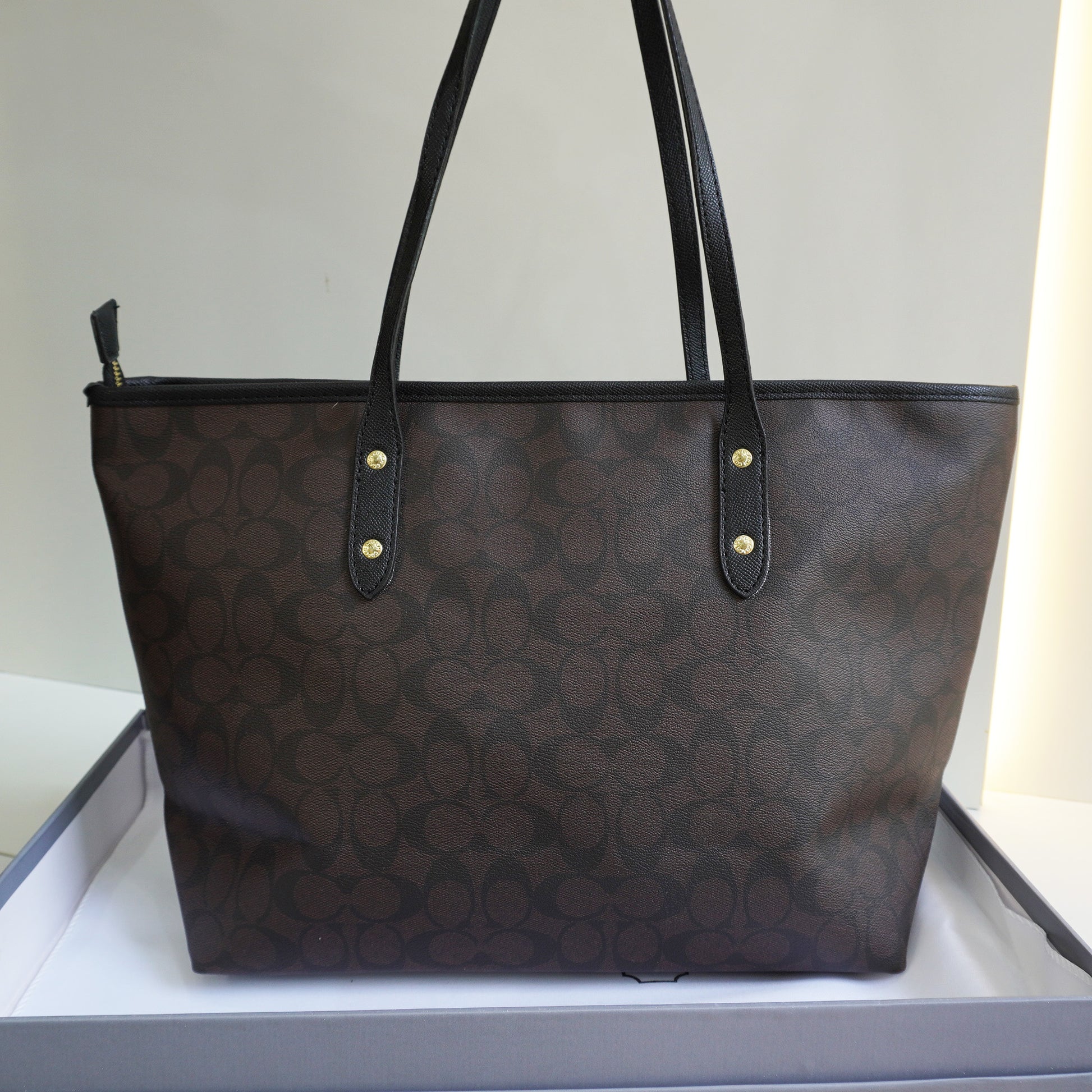 Design & Structure: The bag has a spacious rectangular silhouette, perfect for daily use or travel. Two long black leather shoulder straps are securely attached with gold-tone rivets for both style and support.