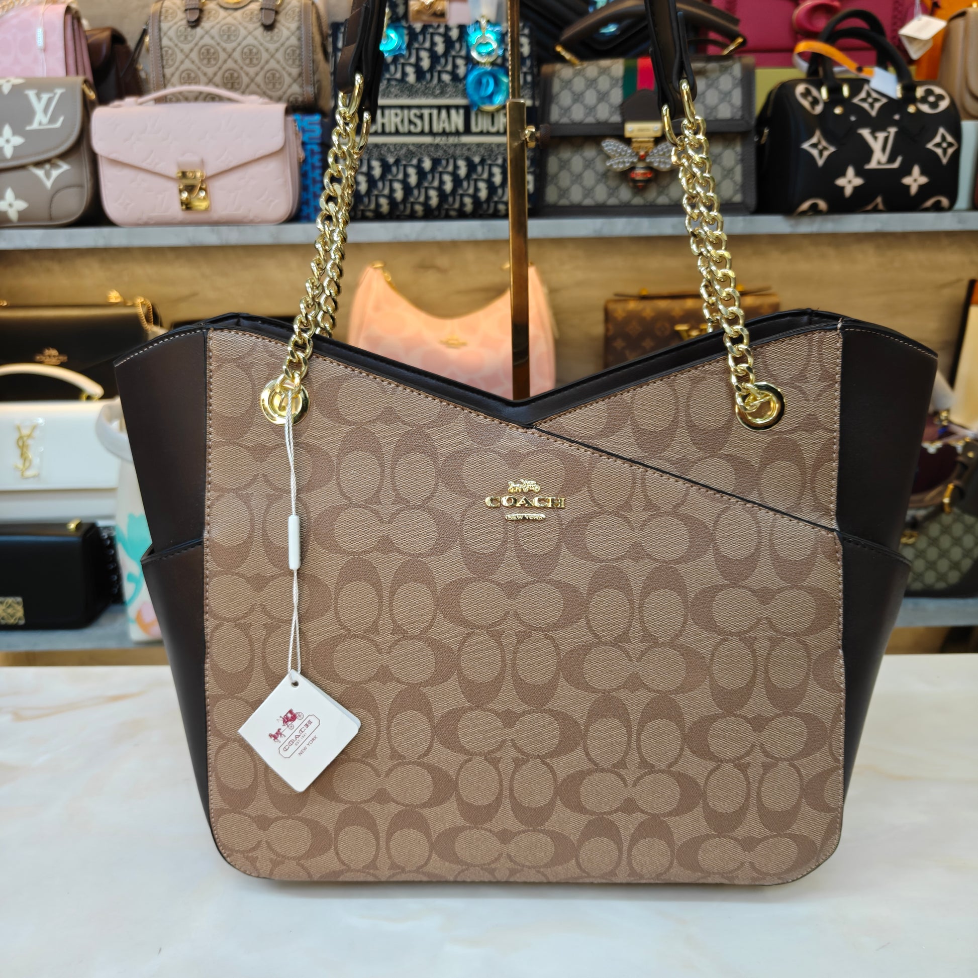 This chic tote bag showcases a elegant combination of signature patterned canvas and smooth leather accents, offering a modern yet timeless appeal. Designed with a spacious open interior, it accommodates daily essentials with ease — perfect for work, travel, or everyday errands. The sturdy chain-and-leather shoulder straps add a touch of luxe while ensuring comfortable carry. Finished with polished metal hardware, this versatile tote blends style and practicality effortlessly, making it a go-to choice for everyday sophistication.