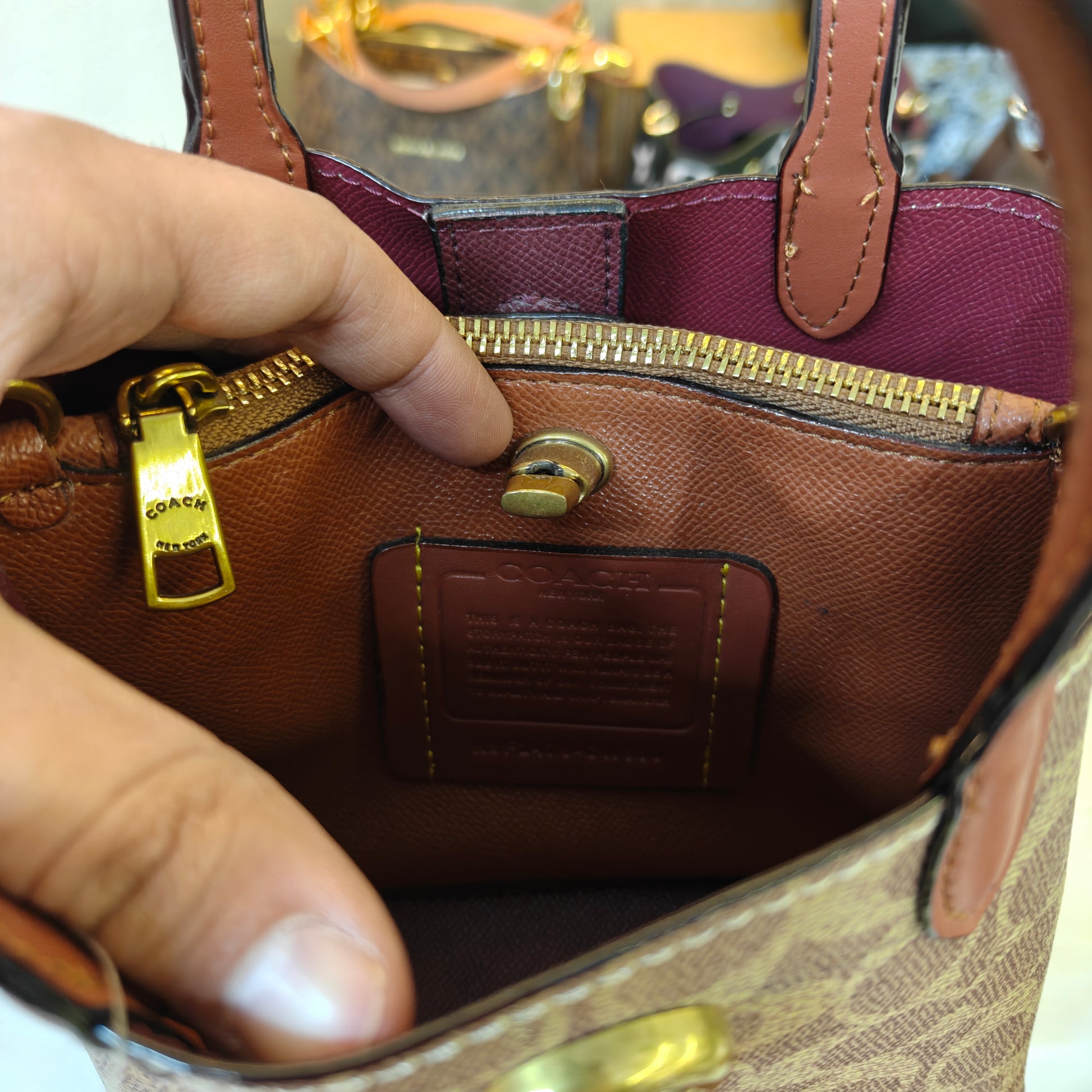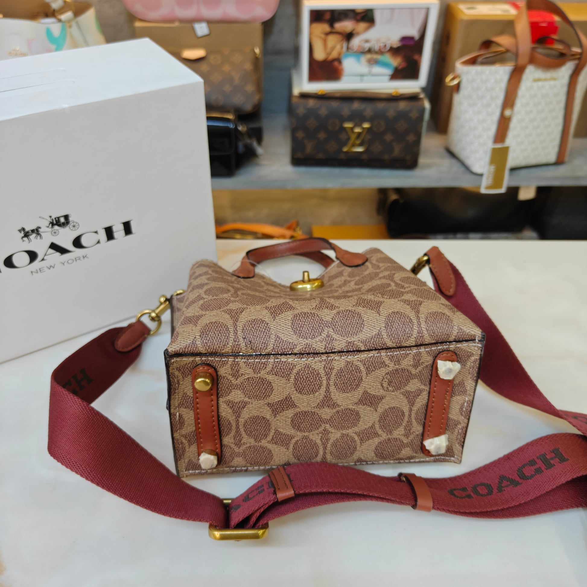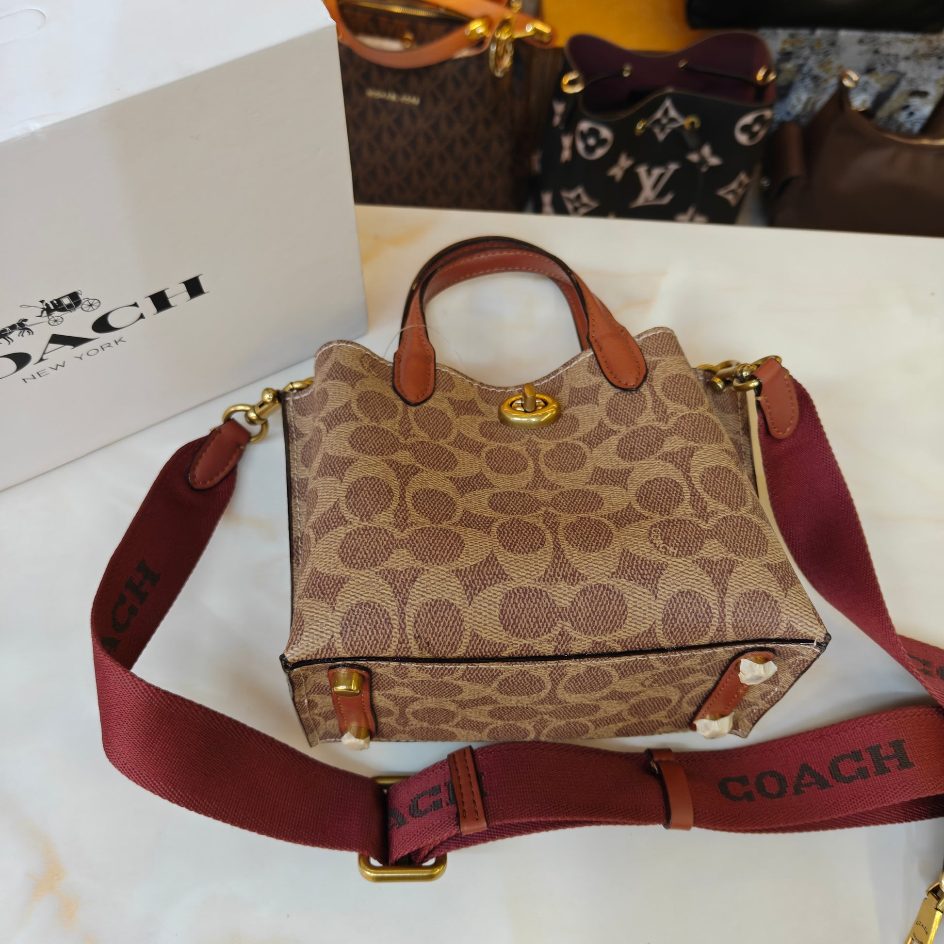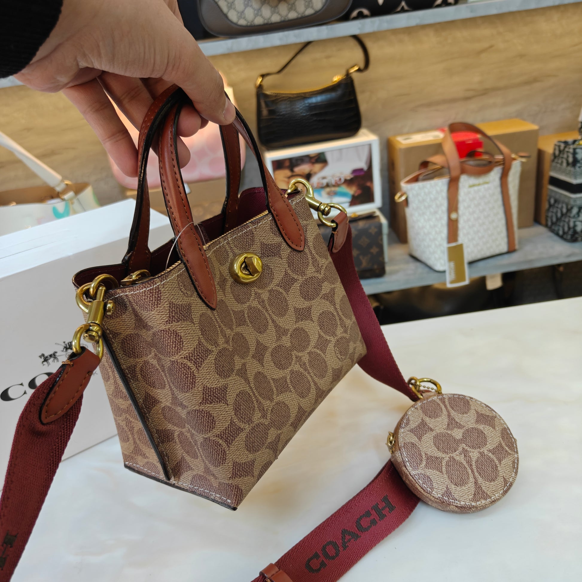 This compact satchel combines a classic monogram pattern with smooth leather trim for a refined, timeless look. Featuring dual top handles and a wide detachable fabric strap, it offers both handbag and crossbody styling options. A polished turn-lock closure adds a signature touch, while the matching round coin pouch provides convenient storage for small essentials. Stylish, functional, and easy to carry, it’s the perfect everyday mini bag with a modern twist.