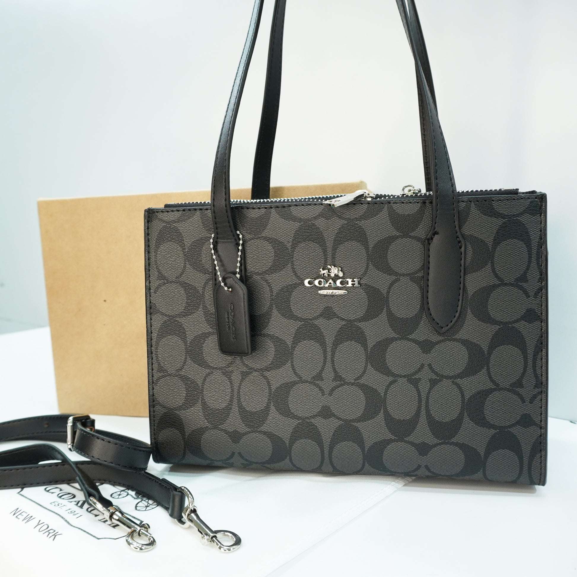 This compact structured tote is crafted from premium leather with an elegant deep brown finish, subtly embossed with a signature monogram pattern. Designed for versatility, it features twin top handles and a detachable, adjustable long strap for both hand-held and crossbody wear. The bag includes two zip-top compartments and a central magnetic-snap section for quick access to essentials. Inside, it's lined with smooth black fabric and includes organized slip pockets. Finished with silver-tone hardware, this sleek, functional piece effortlessly balances style and practicality—ideal for both workdays and weekends.
