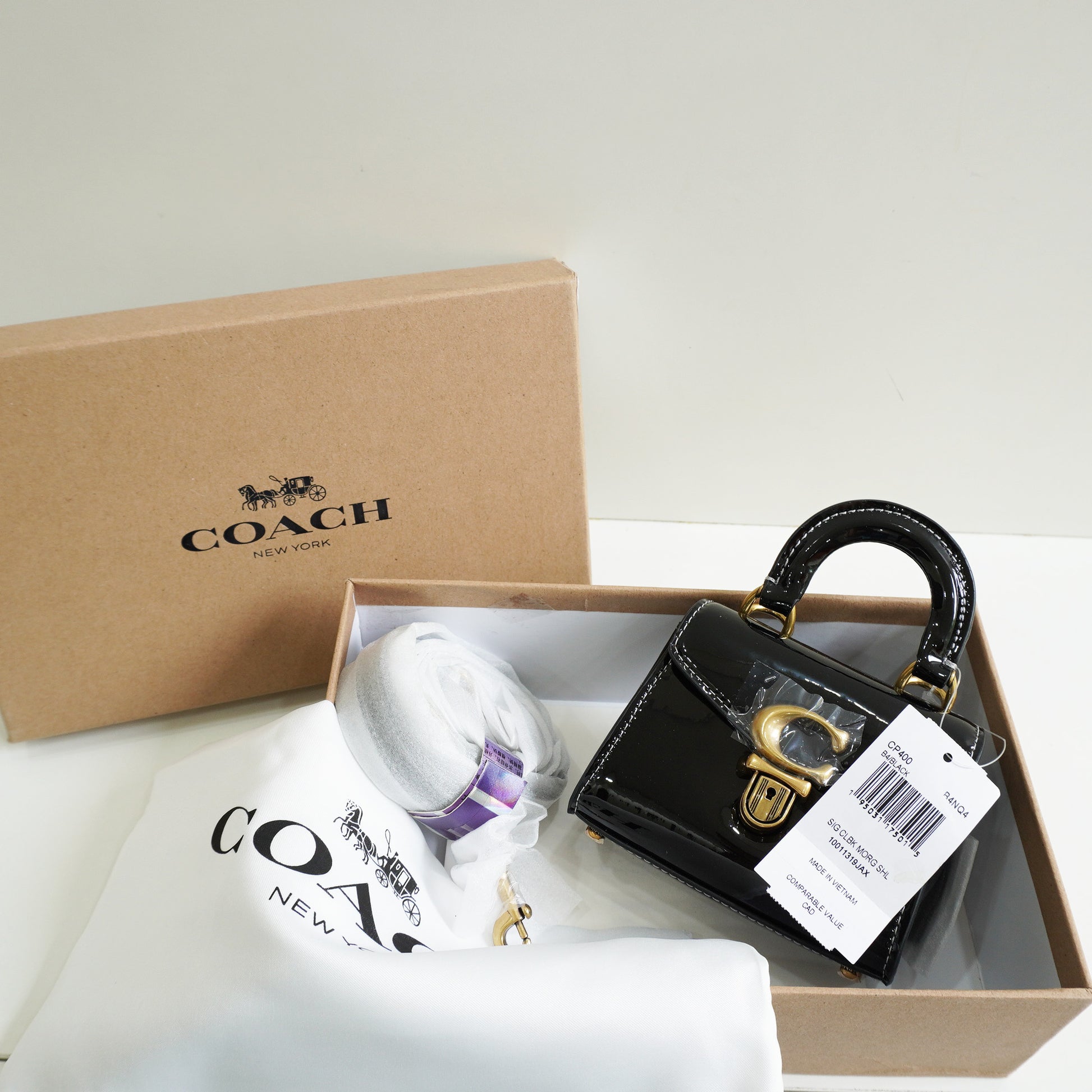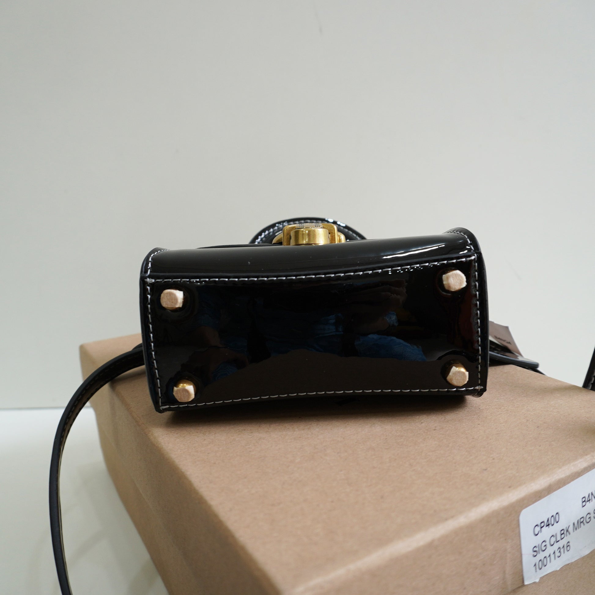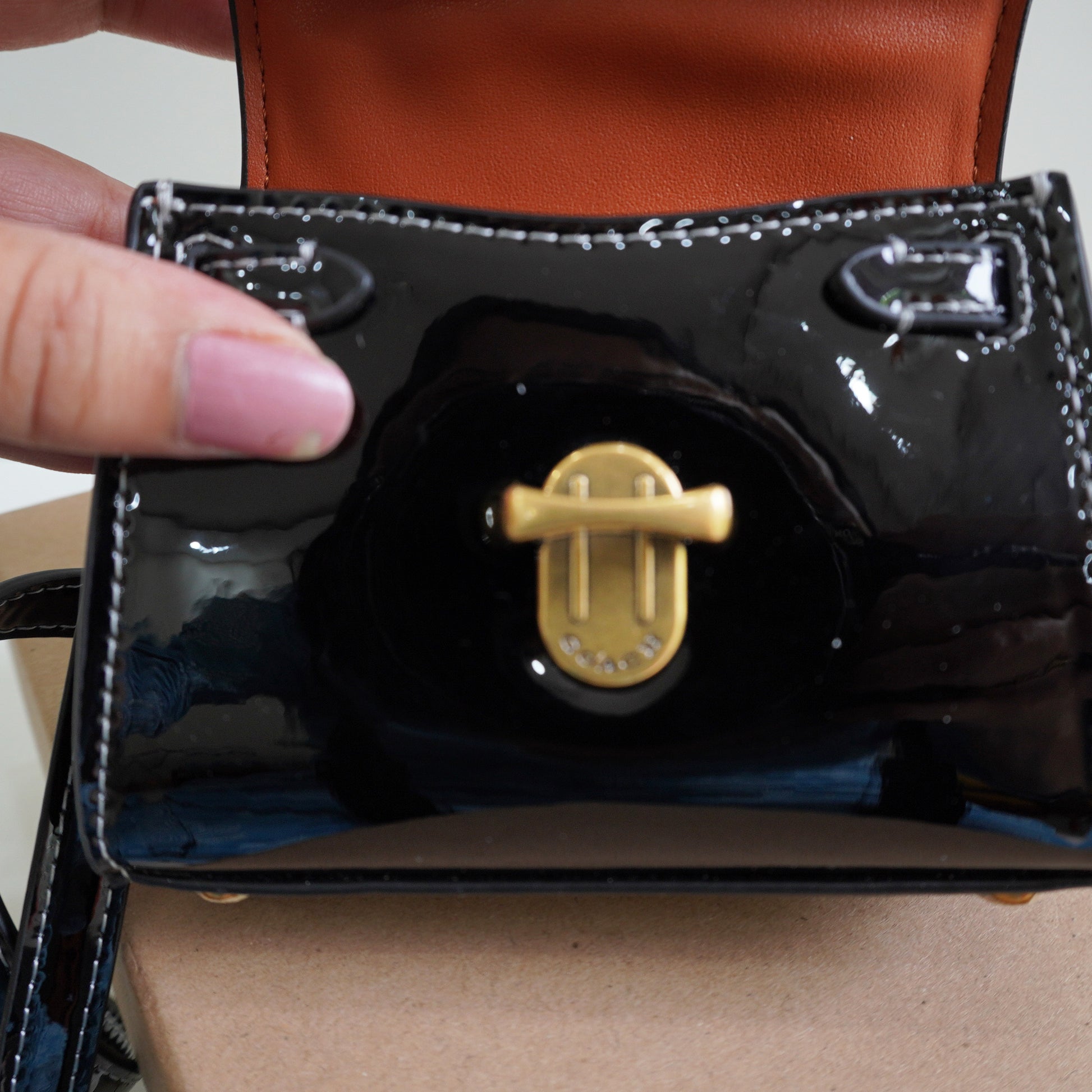 This chic and compact mini handbag is crafted in glossy patent leather, exuding elegance in a sleek black finish. Designed with a structured silhouette, it features a top handle and a long adjustable strap for versatile styling—as a crossbody or handbag. The gold-tone turn-lock closure adds a vintage charm, while the contrast interior offers just enough space for small essentials. Ideal for special occasions or as a statement accessory, it comes with premium packaging and a protective dust bag.