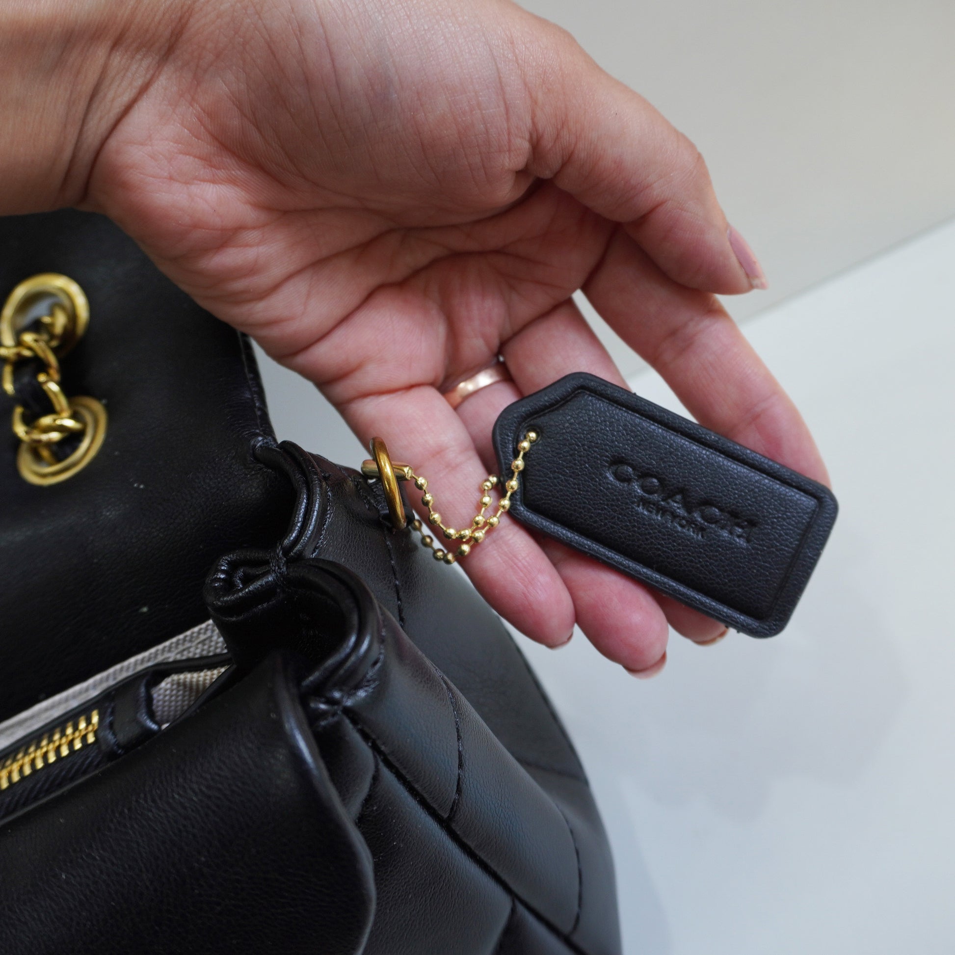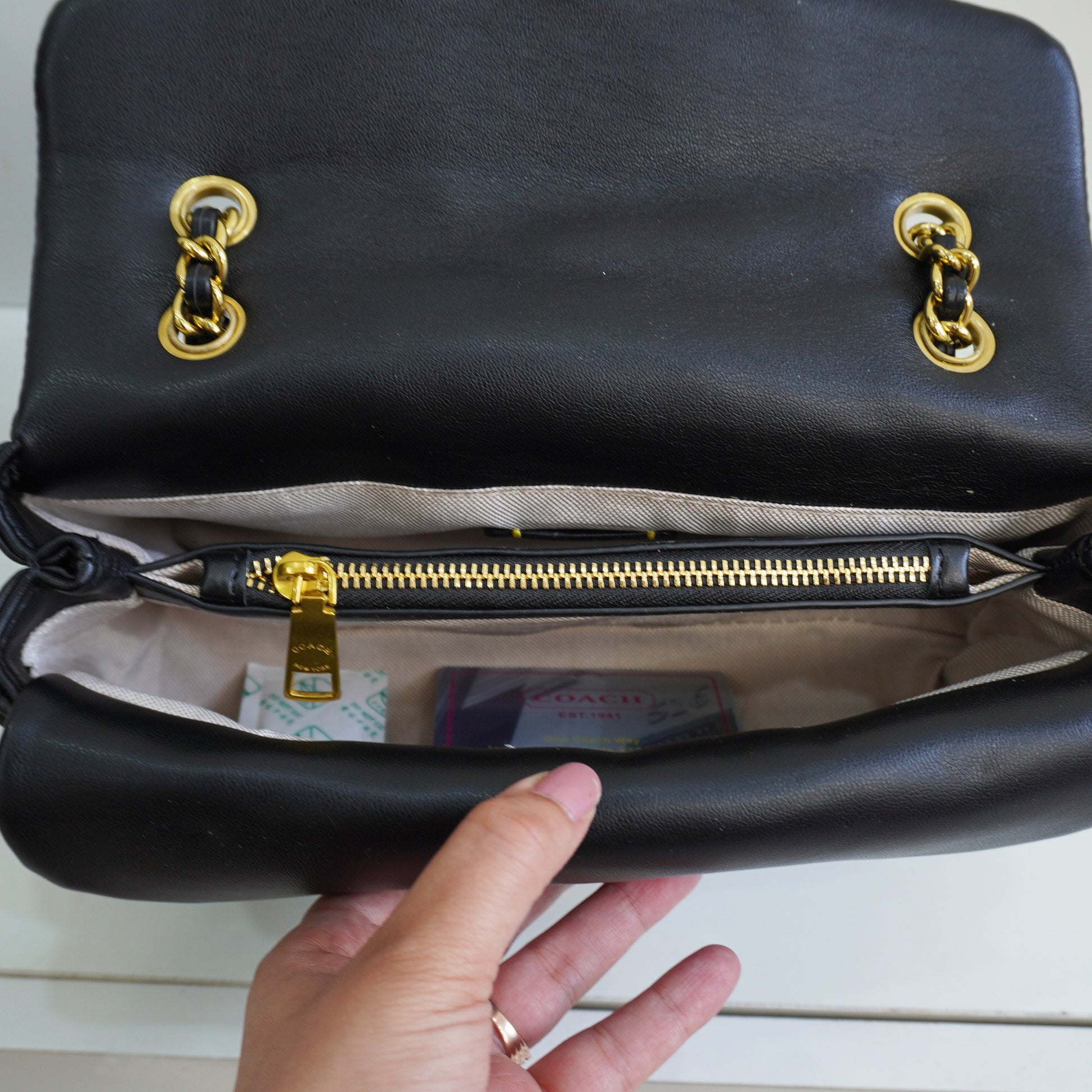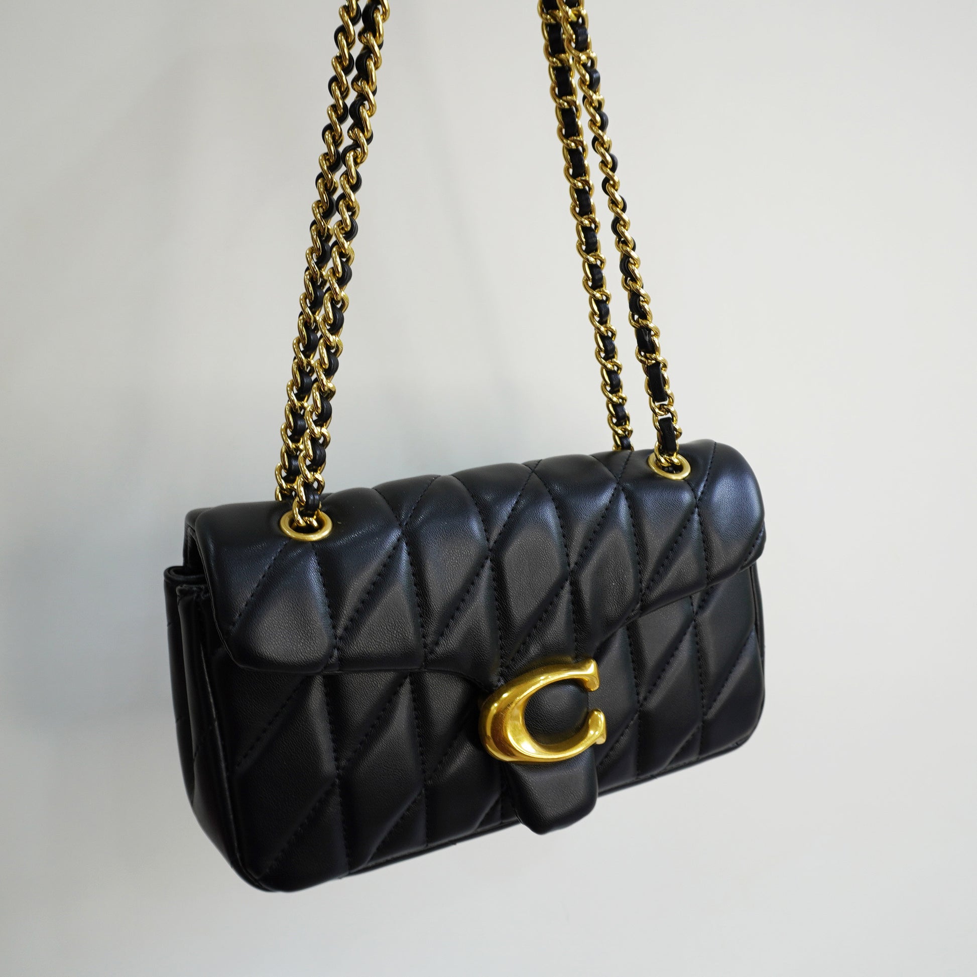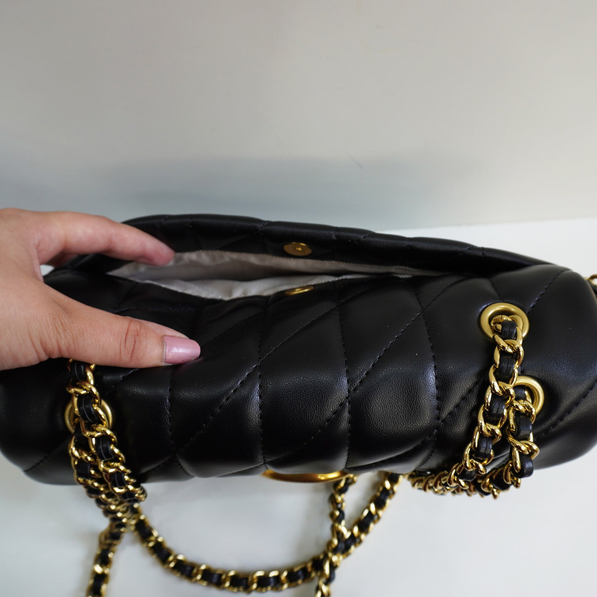 Elevate your look with this sophisticated black shoulder bag featuring a plush quilted exterior and a structured silhouette. Accented with a bold gold-tone clasp and matching dual-chain strap, it blends classic design with a hint of modern luxury. The interior offers a spacious main compartment with a secure zipper pocket, ideal for organizing your essentials with ease. Perfect for both day and evening wear, this bag adds a refined touch to any outfit.
