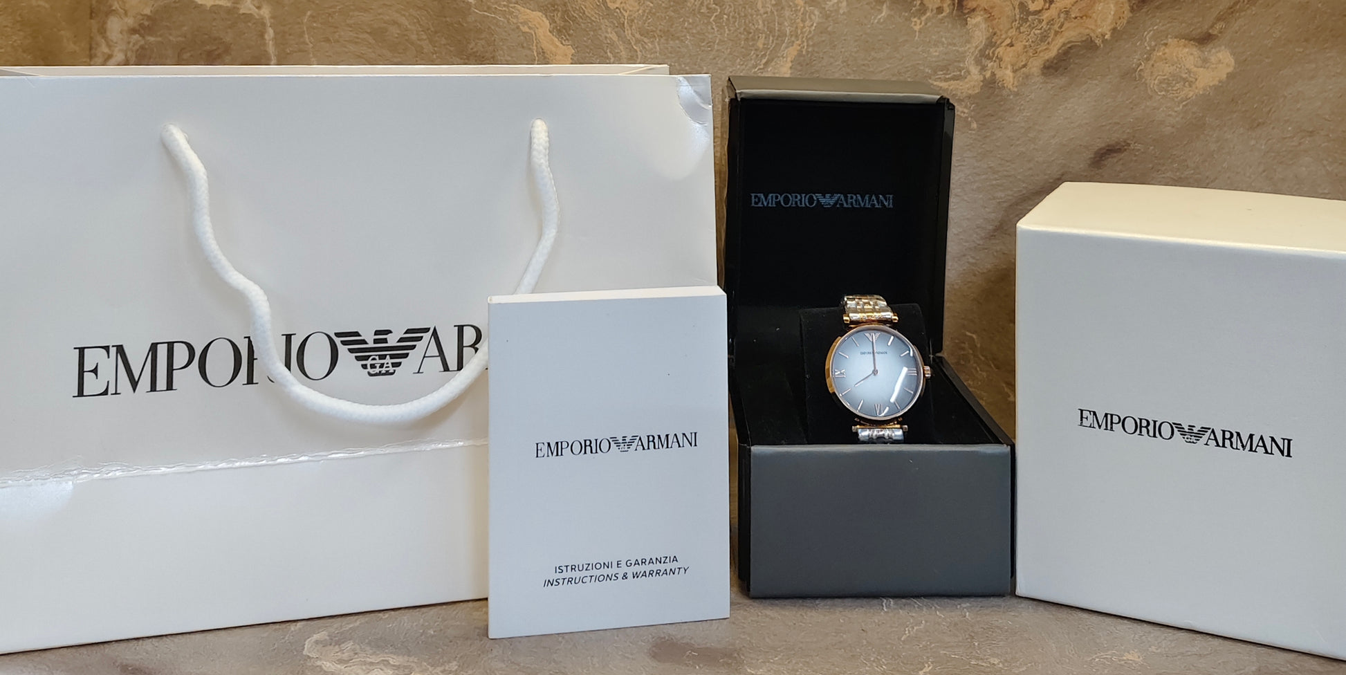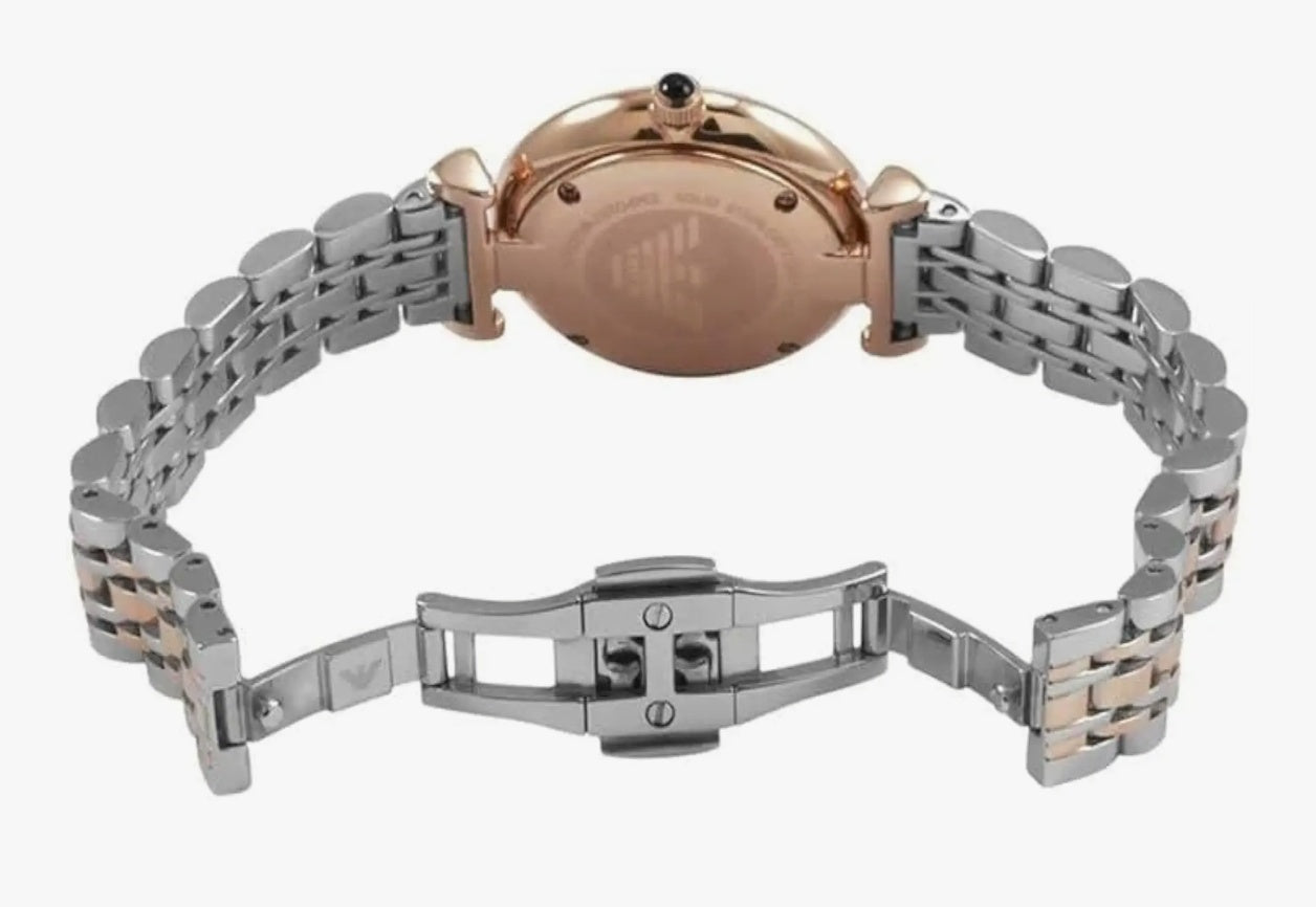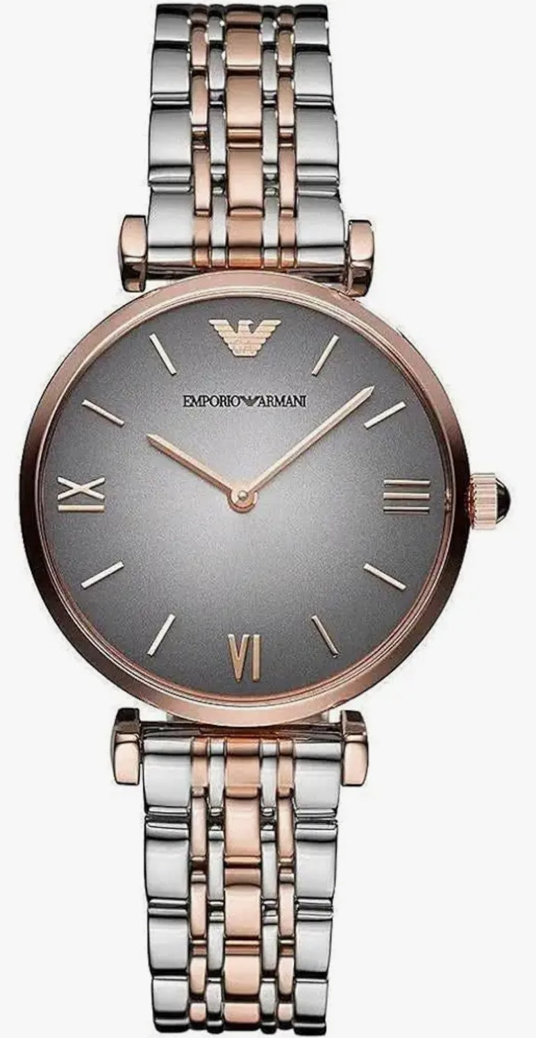 This E A ladies watch from the Gianni T-Bar range has a grey dial with sophisticated Roman numeral markings. It is set in a rose gold ion-plated stainless steel case and a seriously stylish two-tone rose gold ion-plated and stainless steel bracelet.