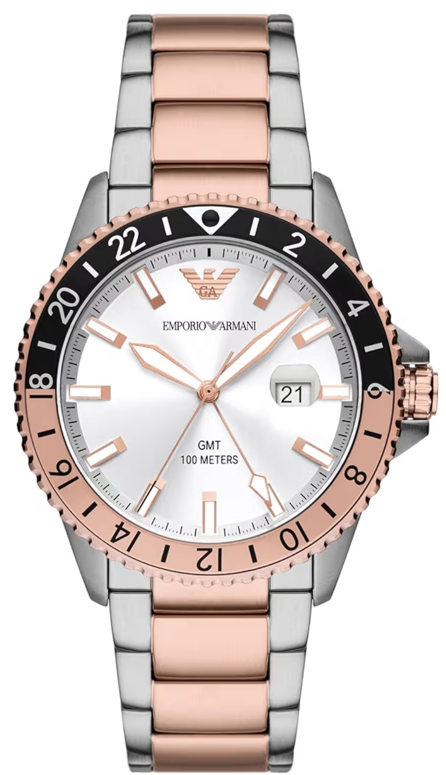 42mm case, 22mm band width, mineral crystal, Quartz movement with a GMT dual time analog display, imported.