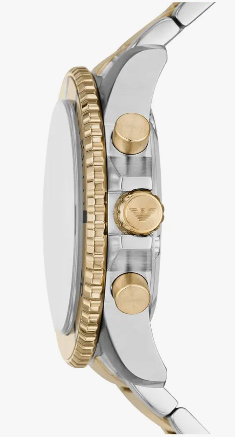 E A 43.5mm watch features a green sunray dial with cd finishing on counters, gold-tone accents, chronograph movement and two-tone stainless steel bracelet