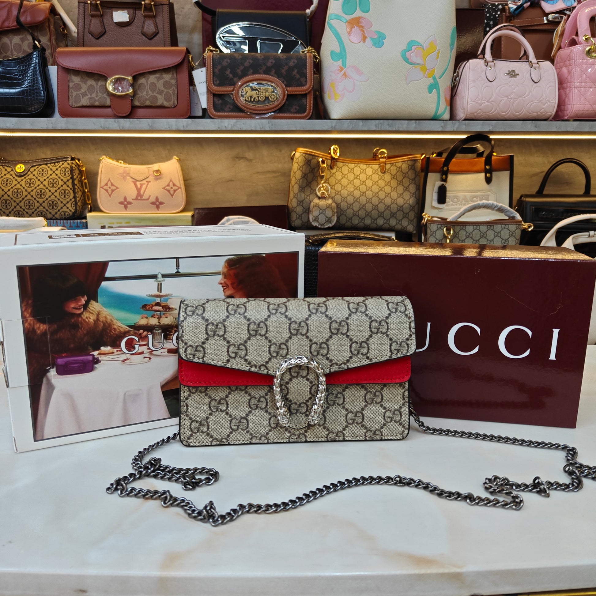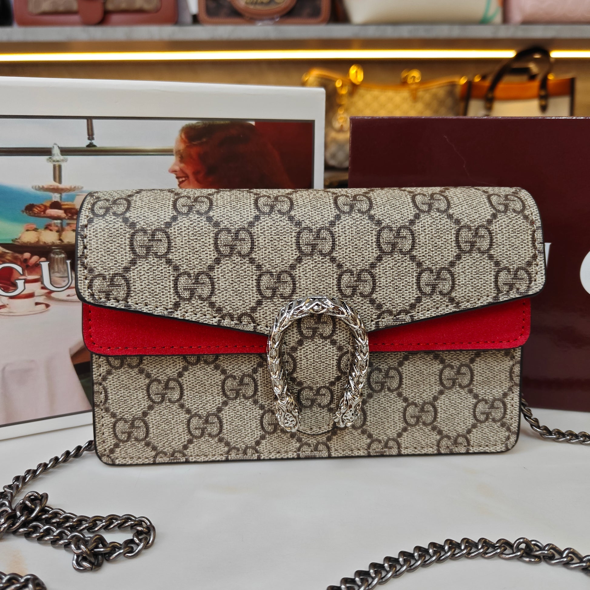 This elegant shoulder bag features a classic monogram leather design accented with a bold red leather trim for a striking contrast. The front flap is adorned with a distinctive silver-tone buckle detail, adding a touch of sophistication and character. It includes a sleek chain strap for versatile styling, allowing it to be worn on the shoulder or as a crossbody. Presented with premium packaging, this piece perfectly blends timeless design with modern elegance.