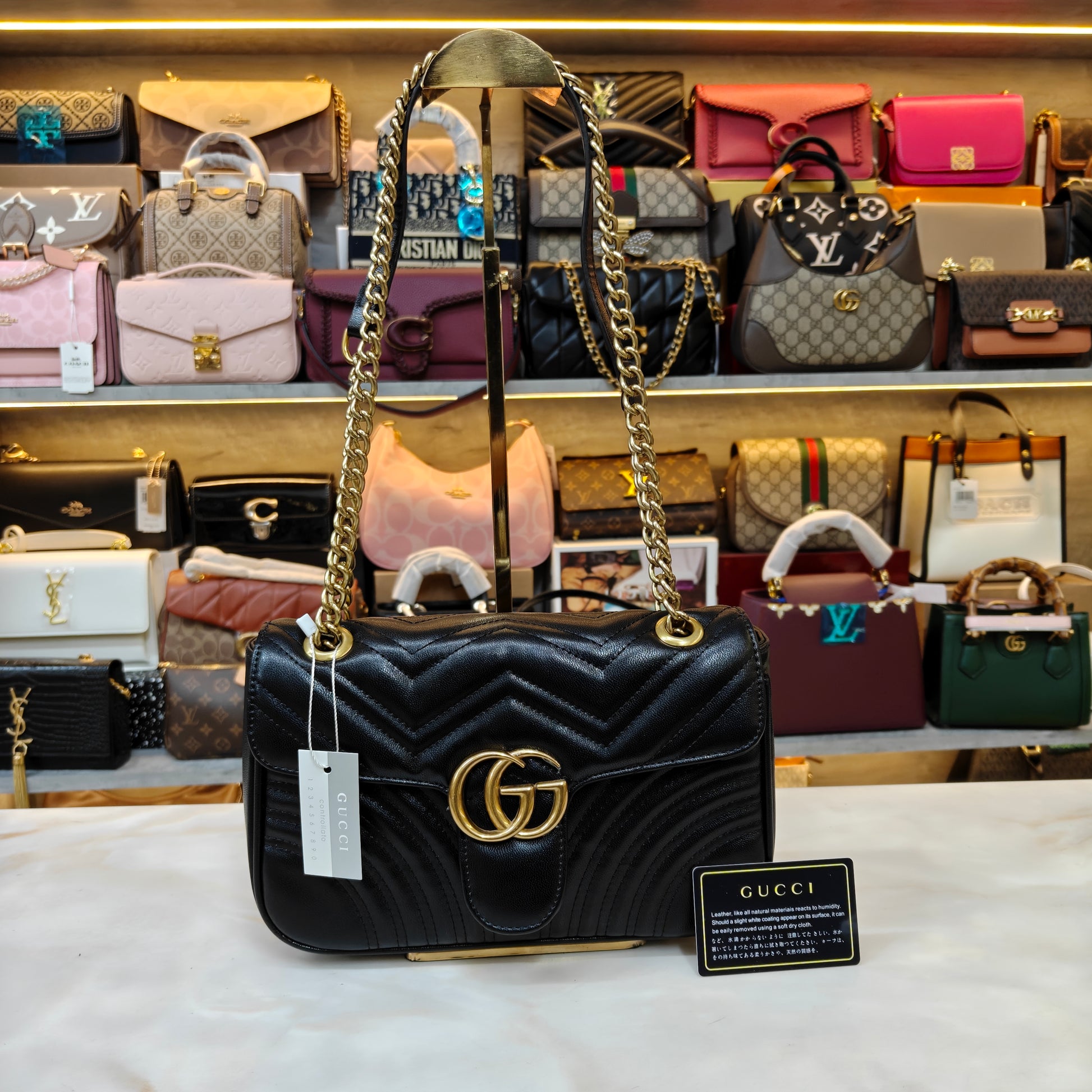 This timeless shoulder bag features a soft, quilted leather design in classic black with a chevron pattern for a sophisticated touch. The front flap is adorned with the iconic interlocking gold double G logo, adding a luxurious accent. It includes a sliding chain strap that can be worn on the shoulder or crossbody for versatile styling. Elegant and effortlessly chic, this bag is perfect for both day and evening occasions.