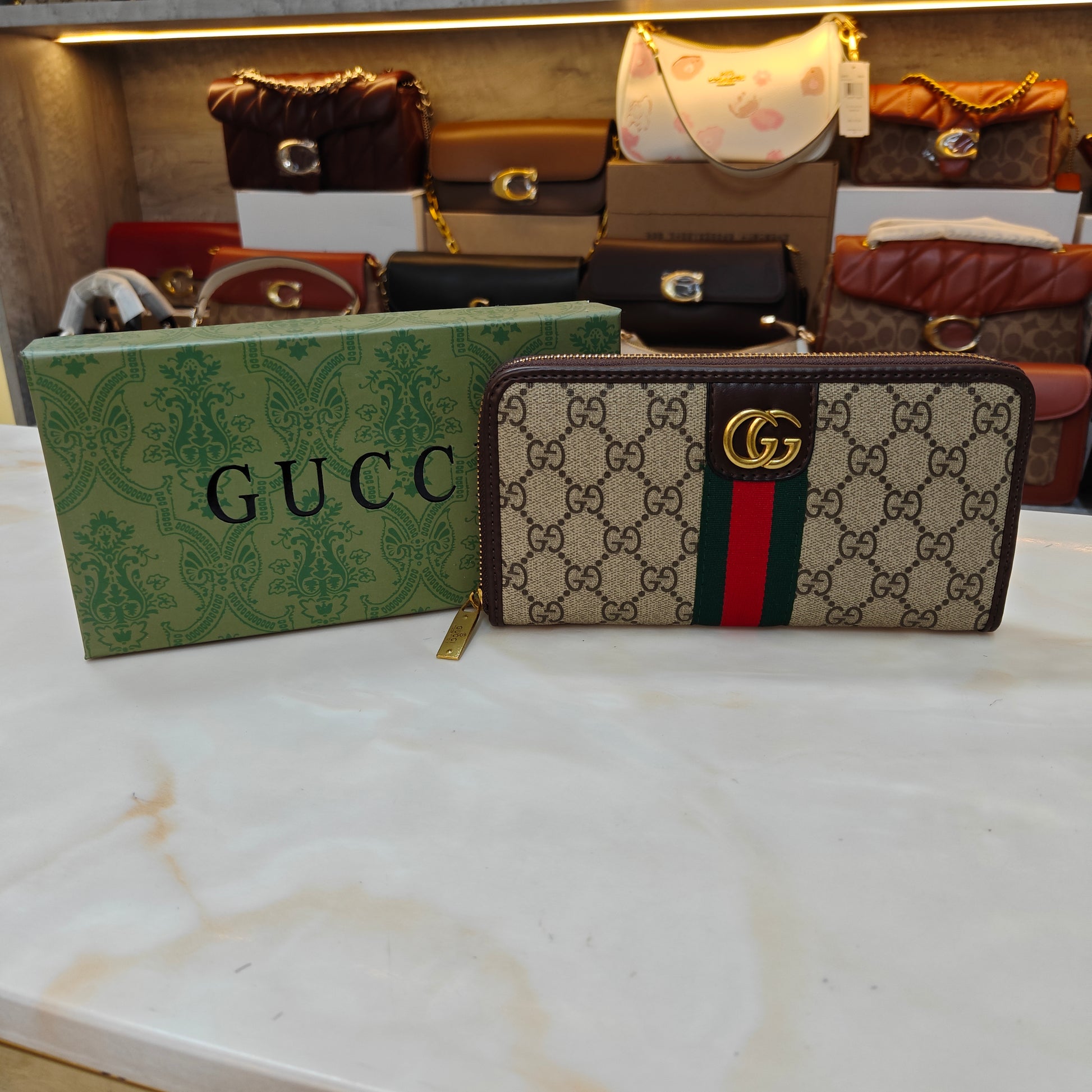 A zip-around wallet showcasing a signature monogram canvas with iconic stripe detailing and a gold-tone logo accent. Its spacious design provides organized storage for cards, cash, and daily essentials with timeless style.