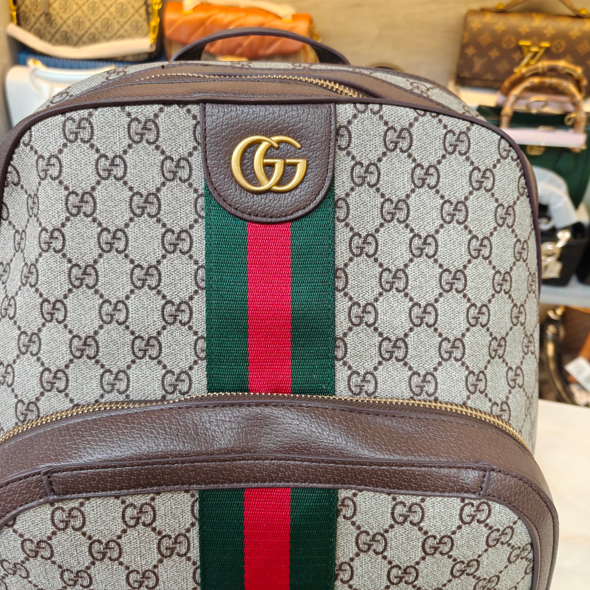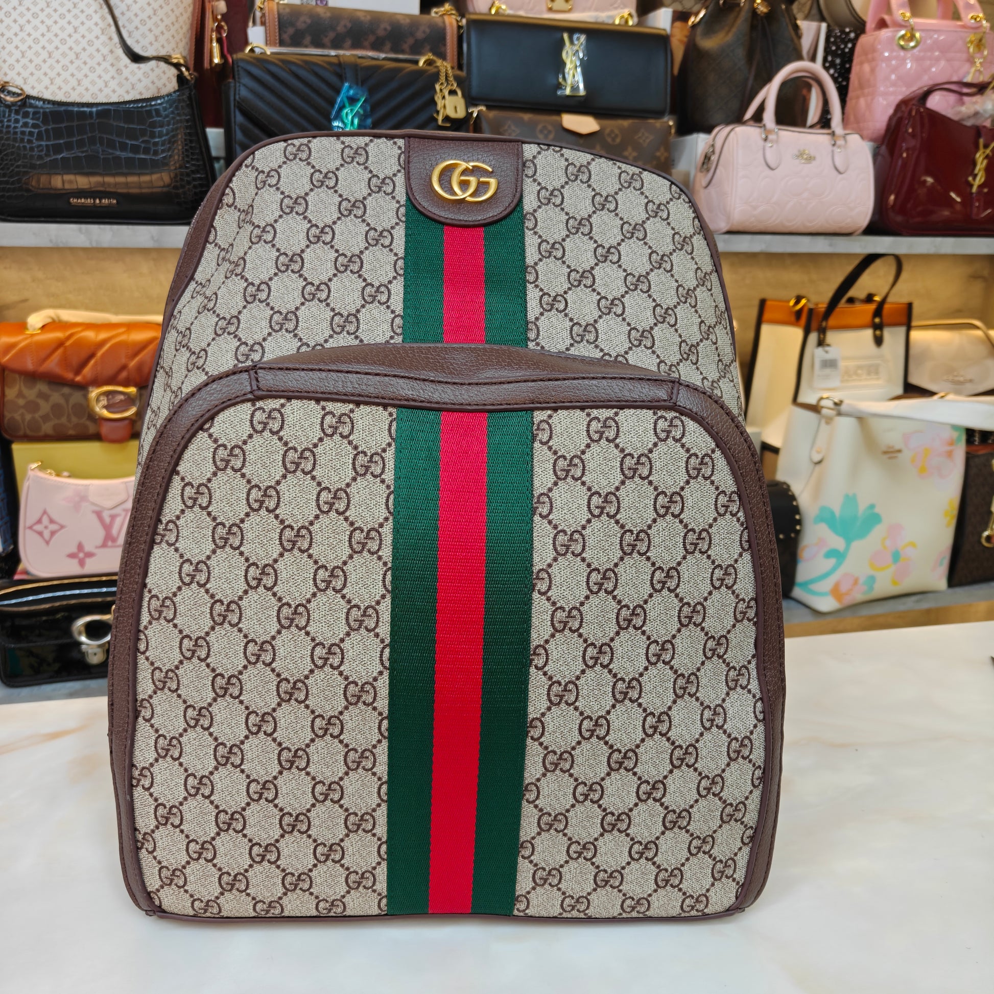 This stylish backpack features the iconic monogram leather design with bold green and red webbing down the center, perfectly capturing a classic and luxurious look. Accented with a gold-tone logo emblem at the top, it combines timeless elegance with practicality. The structured silhouette includes a spacious main compartment, front zip pocket, and comfortable adjustable straps, making it ideal for travel, daily use, or a statement accessory for casual outings.