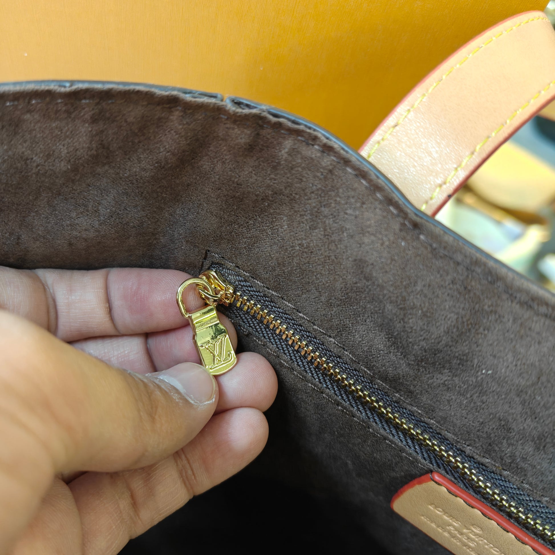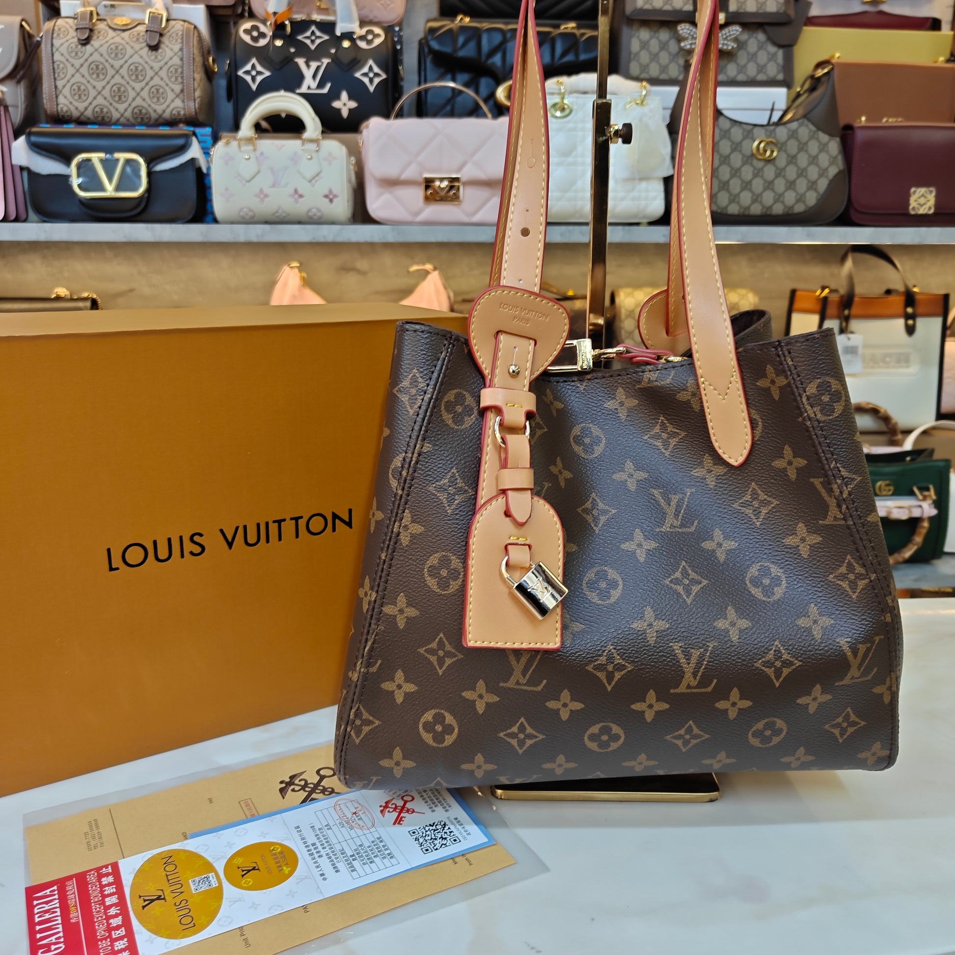 This classic tote bag features a spacious bucket-style silhouette crafted in signature monogram leather with smooth tan leather trim. It’s designed with sturdy top handles and an adjustable, detachable shoulder strap for versatile carrying options. The front is accented with a polished padlock charm for an elegant touch. Perfect for everyday use, this bag offers both style and functionality with its roomy interior and timeless design.