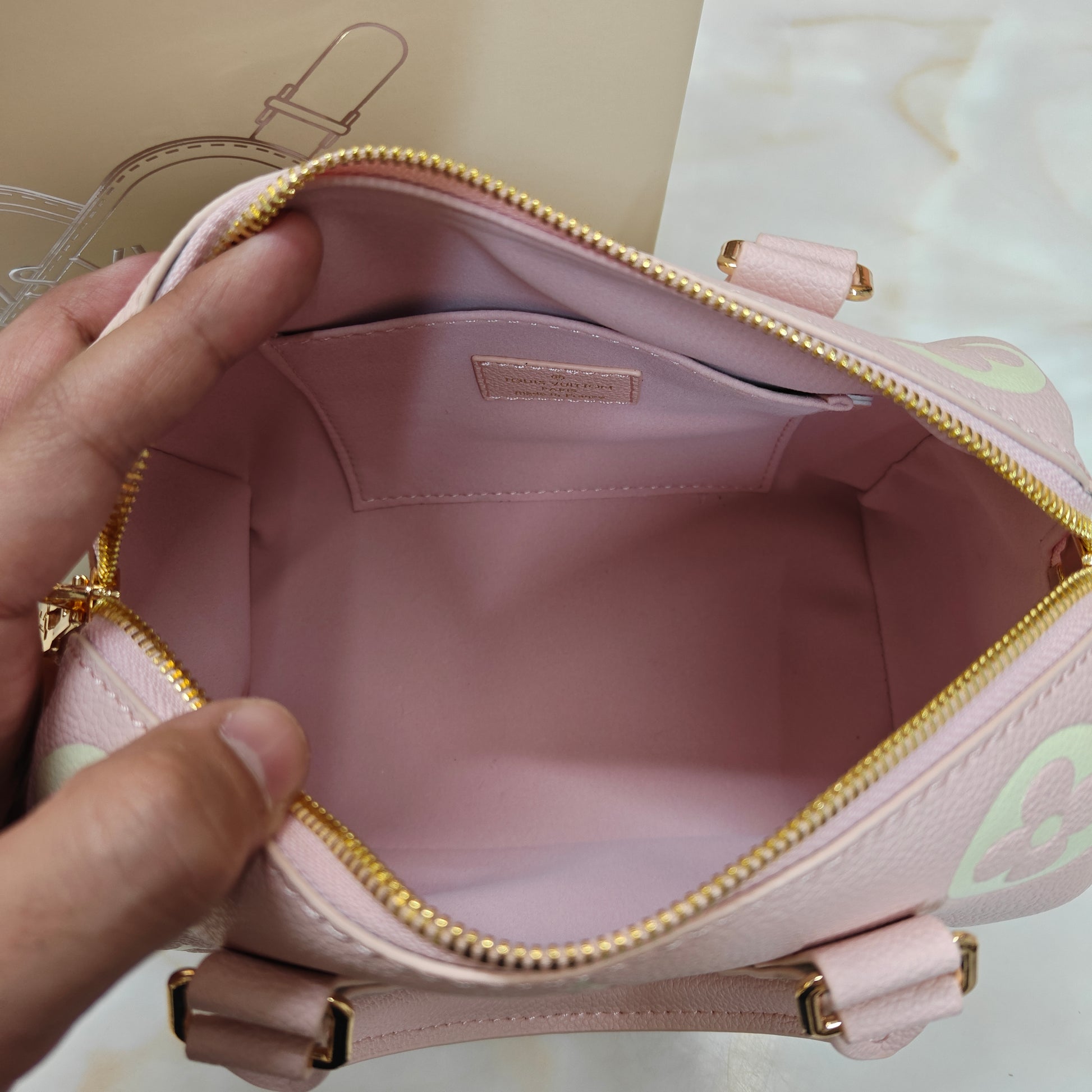 This is a small, structured top-handle handbag in light pink leather with a pebbled texture. It features an all-over oversized floral and geometric motif in a contrasting light cream color, along with a central monogram design. The bag has dual rolled handles, gold-tone hardware, and a compact, boxy silhouette.