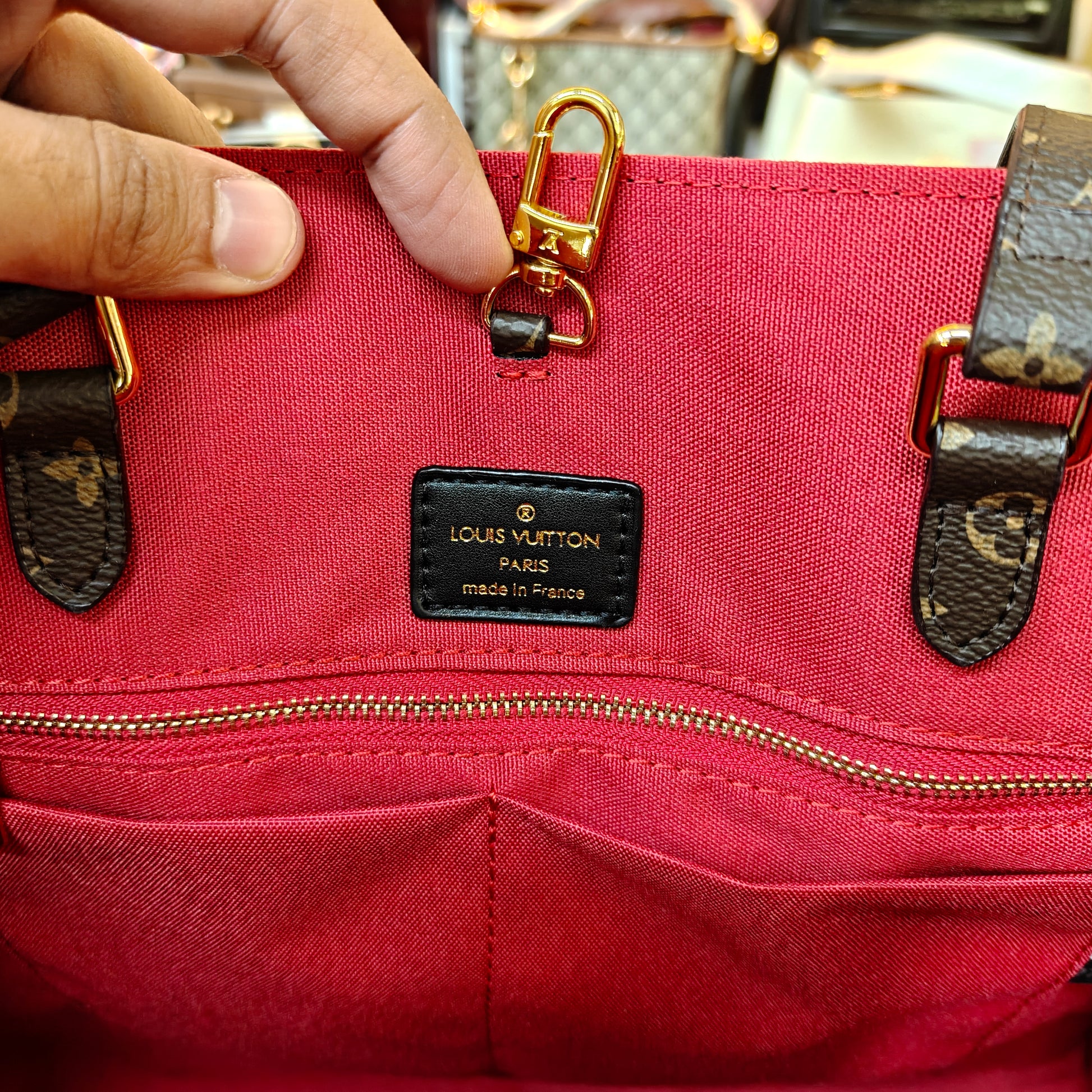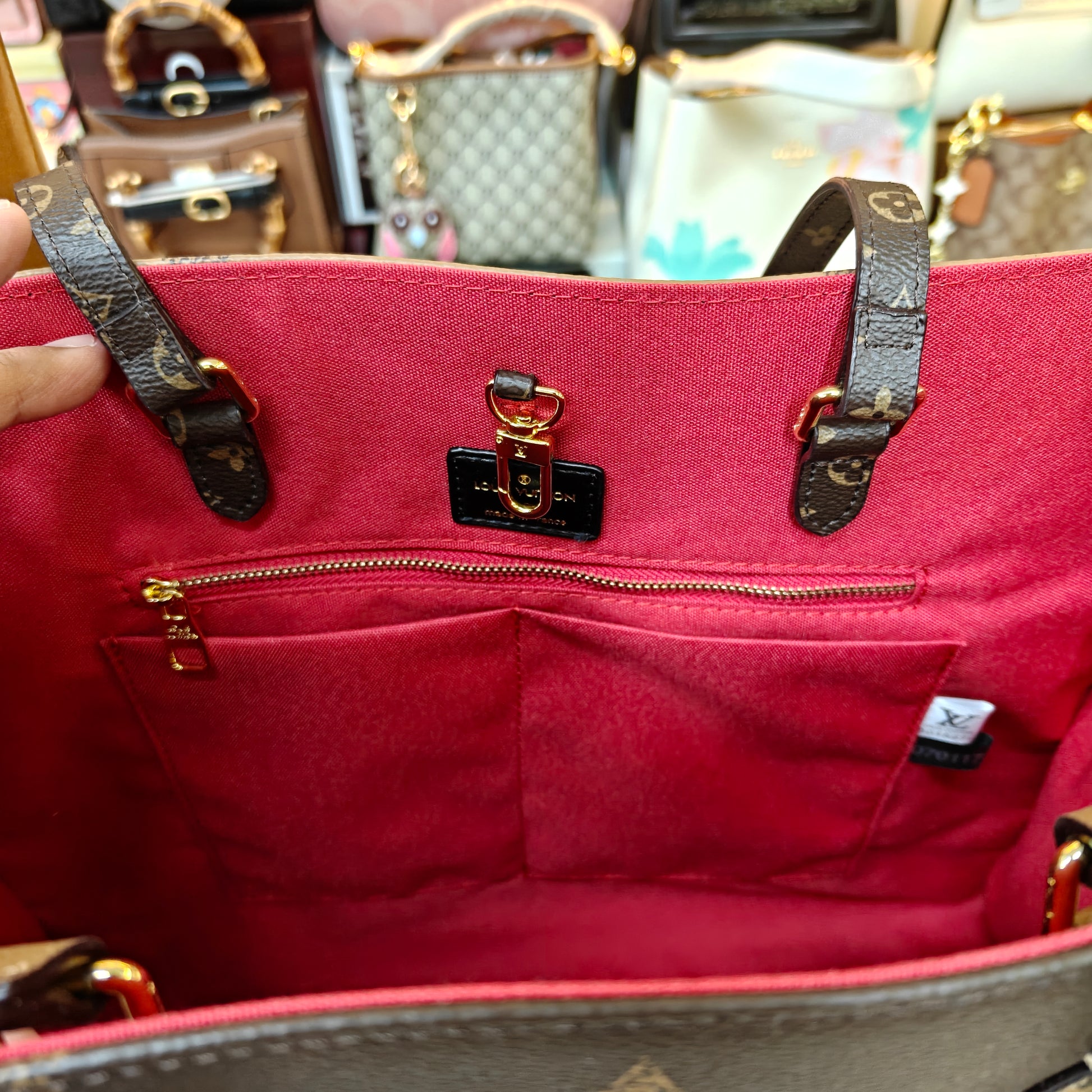 This luxurious tote bag features a classic dark brown leather design accented with oversized monogram motifs for a timeless and iconic look. The top handles, adorned with matching monogram detailing, add a refined touch, while the striking red interior provides a bold contrast. Spacious and structured, it offers ample room for daily essentials, making it both stylish and practical. Presented with signature packaging, this piece exudes elegance, craftsmanship, and everyday sophistication.