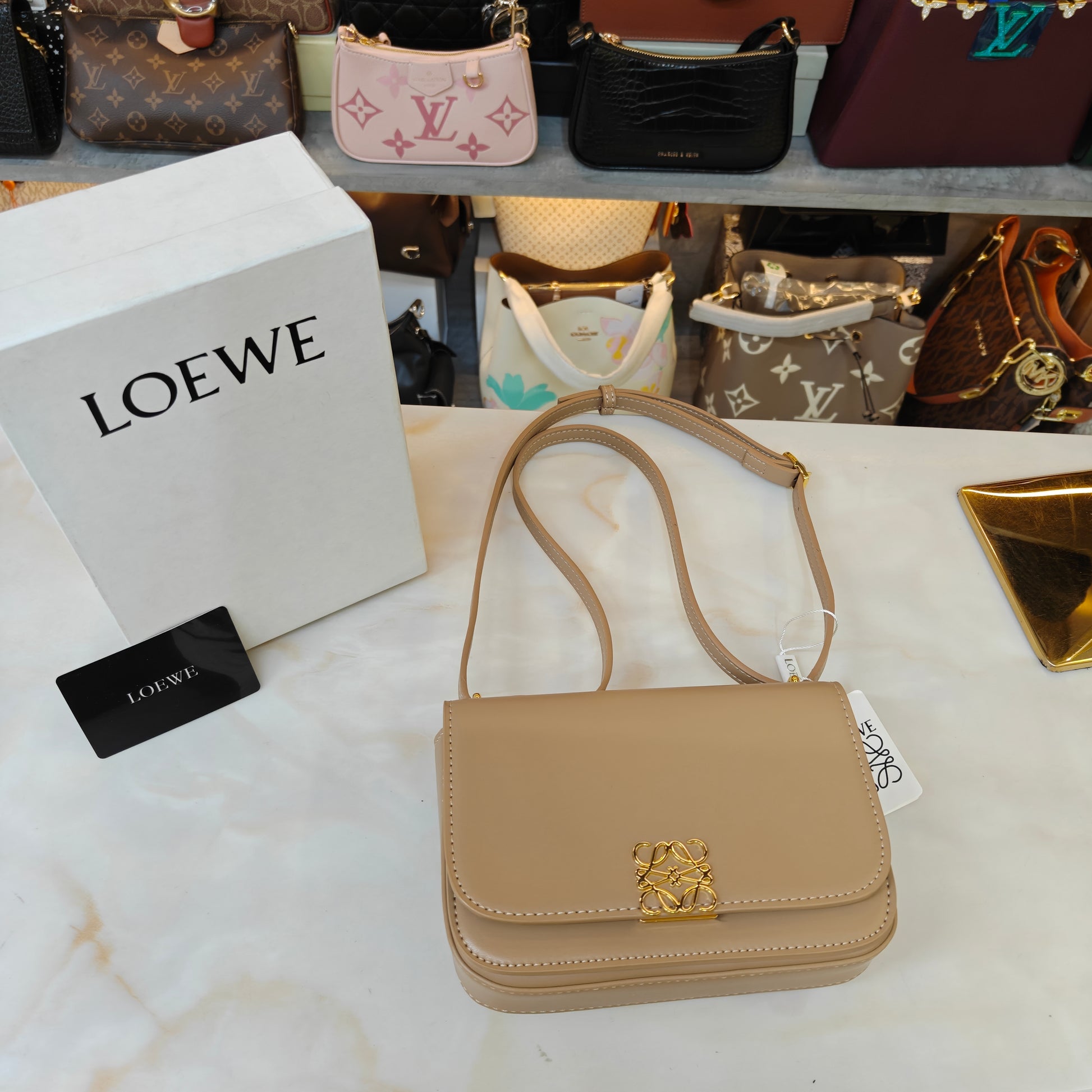 This chic crossbody bag features a clean, structured silhouette crafted in smooth beige leather for a timeless and versatile look. It’s accented with polished gold-tone hardware and a delicate logo detail on the front flap, adding a touch of sophistication. The adjustable shoulder strap allows for easy styling, making it perfect for everyday wear or dressing up an outfit. Elegant and practical, this piece is a classic wardrobe essential.