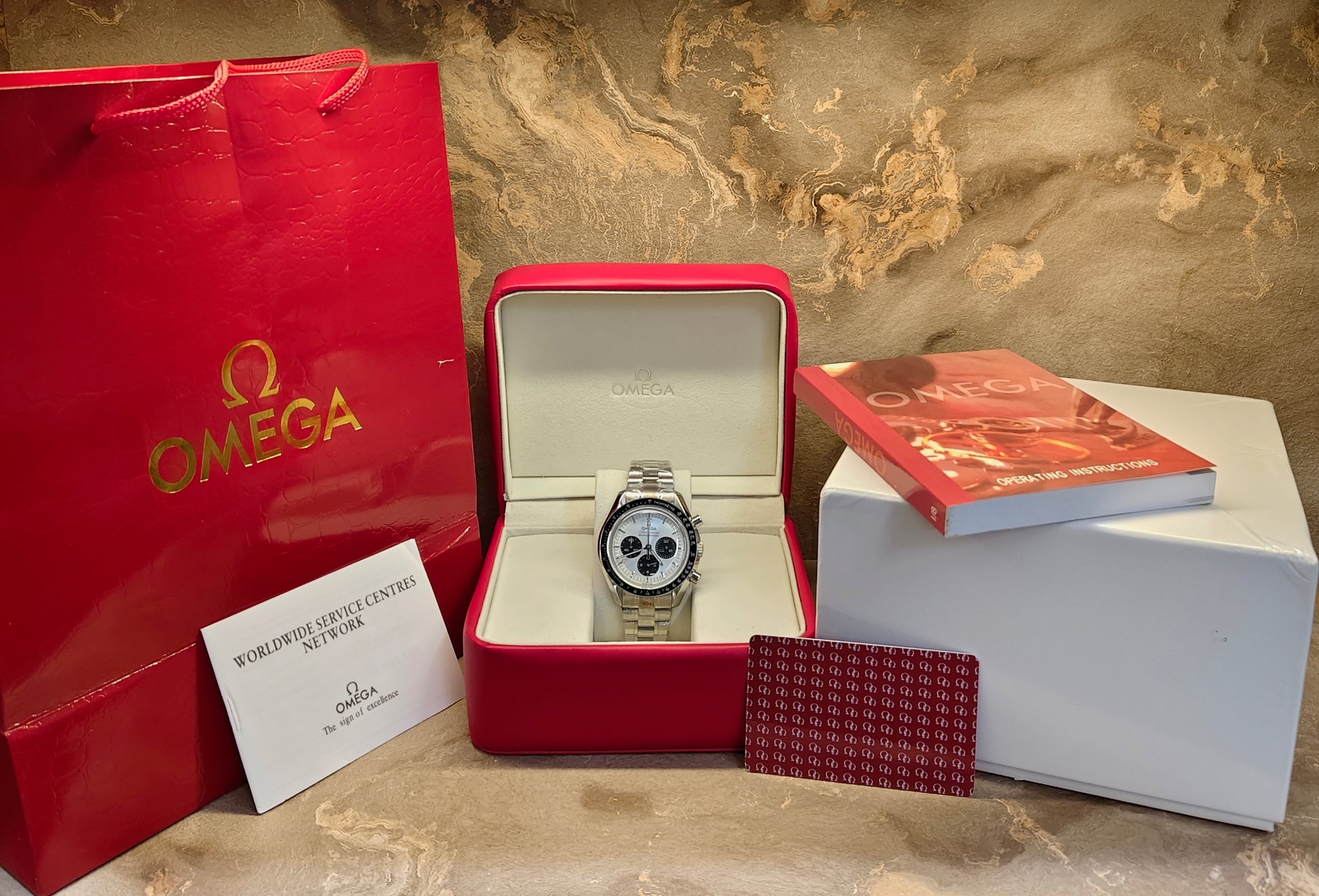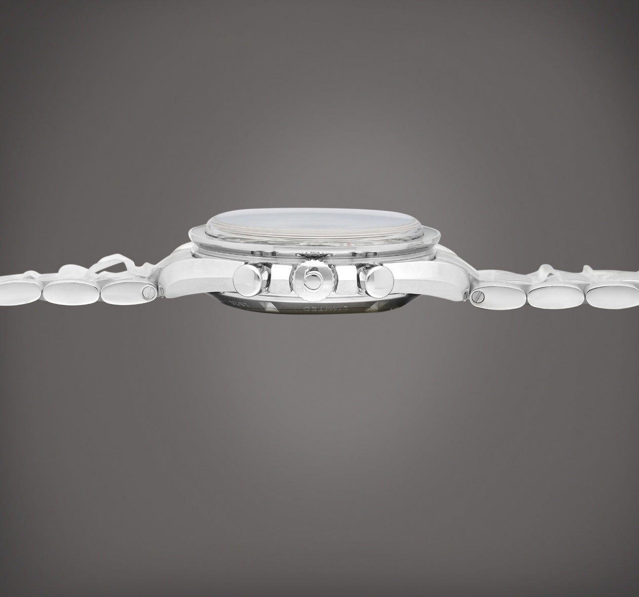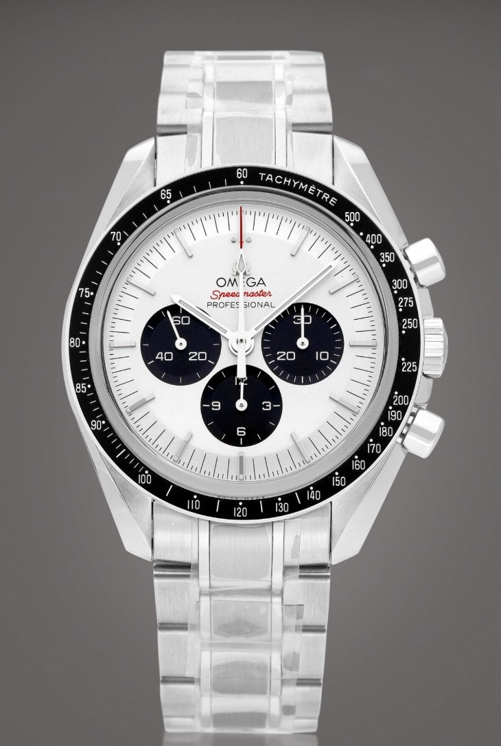 A classic chronograph timepiece with a clean white dial contrasted by bold black sub-dials, giving it a striking “panda” style design. The black tachymeter bezel adds a sporty edge, while the stainless steel case and bracelet provide durability and refinement. With precise chronograph functions and timeless styling, this watch blends performance and elegance effortlessly.