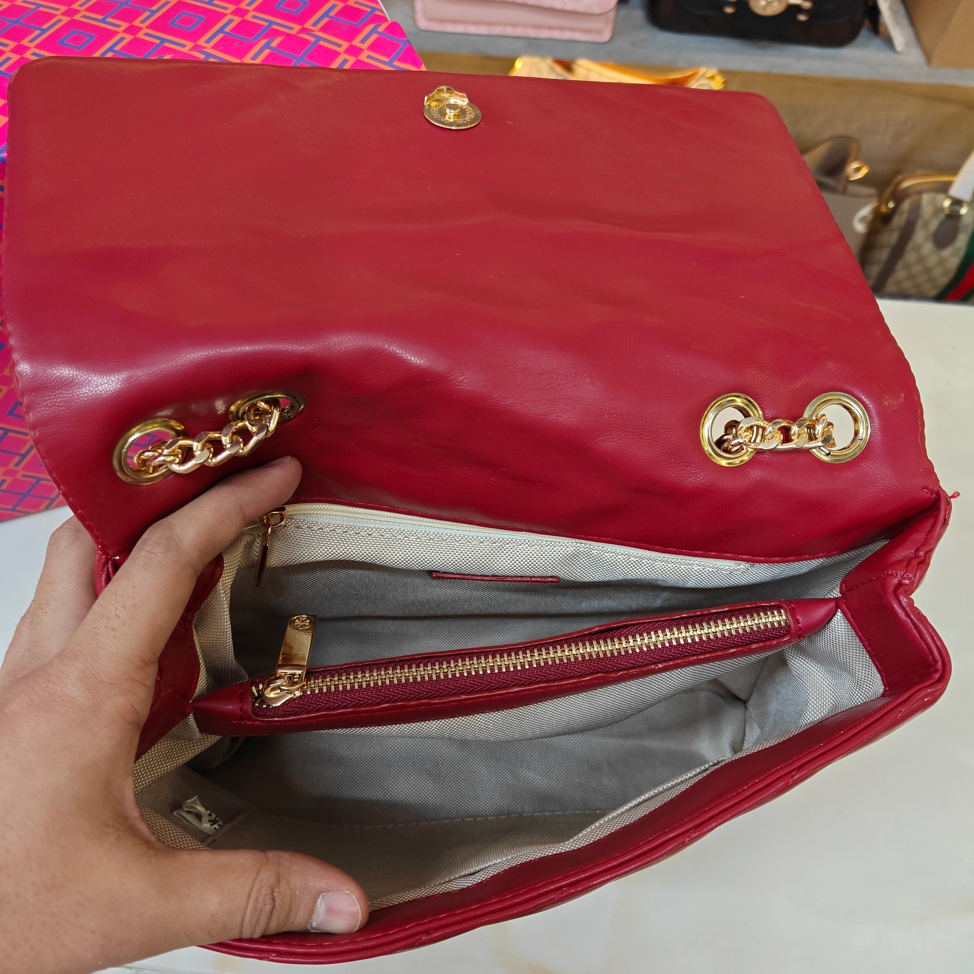This elegant handbag features a quilted design with diagonal stitching, crafted from smooth, taupe-toned leather. It has a structured silhouette with a flap closure, adorned with a gold-tone metallic emblem at the front. The bag is complemented by dual gold chain straps interwoven with leather for added sophistication. Its modern yet classic appeal makes it suitable for both daytime and evening occasions. Comes with a box and dust cover