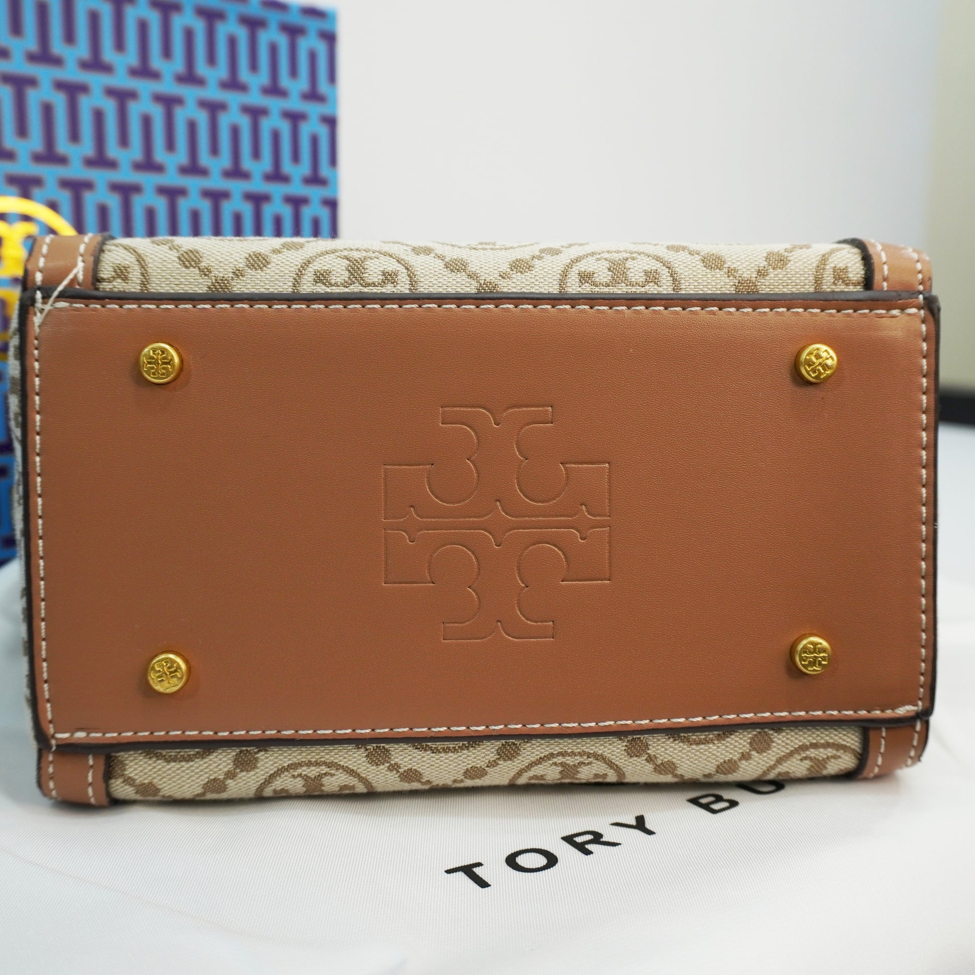 This compact duffle-style handbag brings together timeless design and modern charm. Crafted from beige-toned canvas with a signature all-over monogram pattern, it features structured tan leatherette trims and polished gold-tone hardware. The rounded shape and stitched detailing offer a refined finish, while the dual top handles and long adjustable strap provide both handheld and crossbody options. A zip-top closure secures a neatly lined interior with slip compartments for your small essentials. Finished with gold-tone feet at the base for added durability, this piece is ideal for everyday elegance with a touch of luxury.