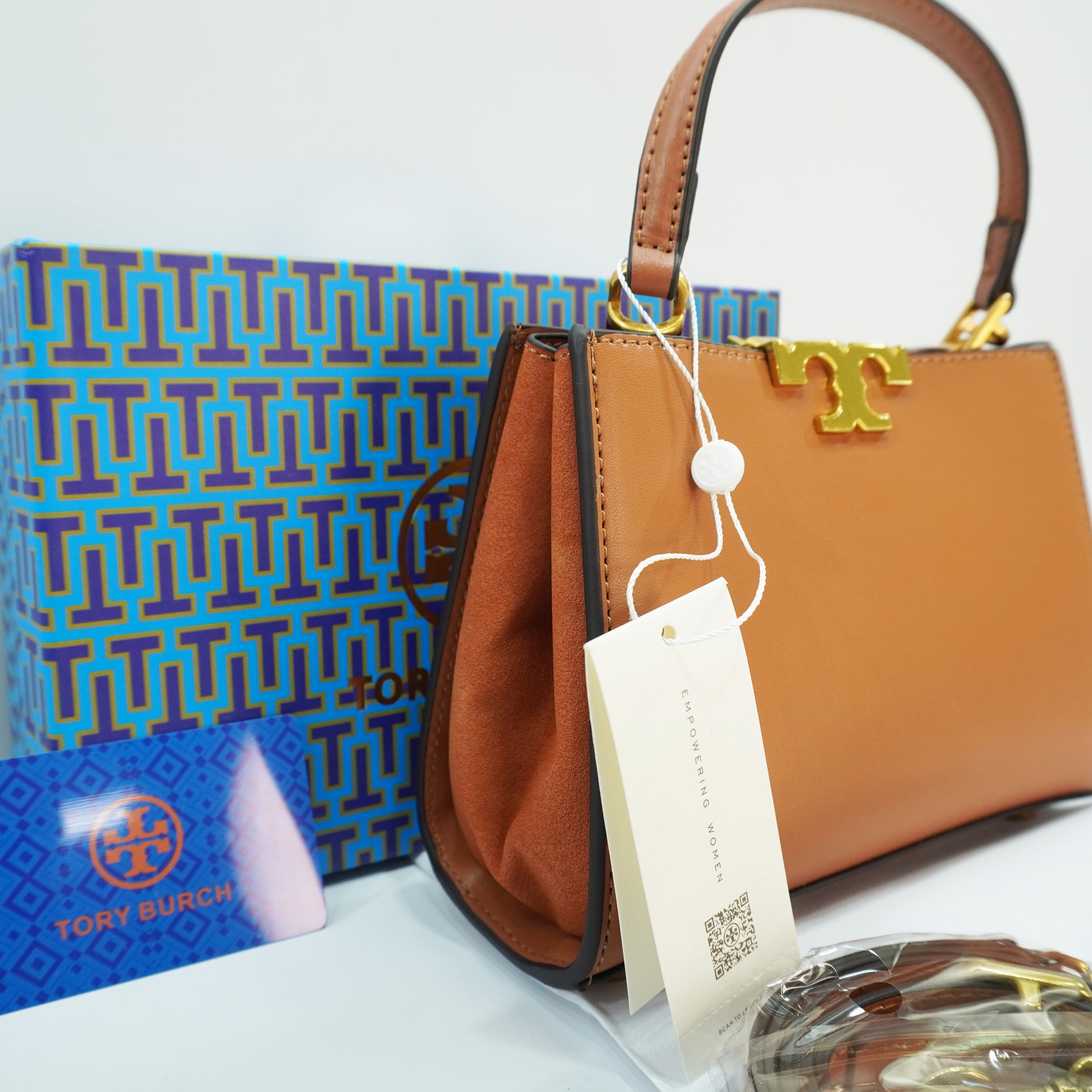 This structured mini top-handle bag is the epitome of understated elegance. Crafted in smooth tan leather, it features a sleek silhouette with a bold gold-tone hardware accent at the closure for a refined finish. The compact frame opens to a neatly divided interior with a contrasting tan lining, offering dedicated space for essentials. Designed with both a sturdy top handle and a detachable long strap, this bag easily transitions from a chic hand-carry to an effortless crossbody. Perfect for elevating both formal and casual looks, it's a sophisticated staple for any occasion.