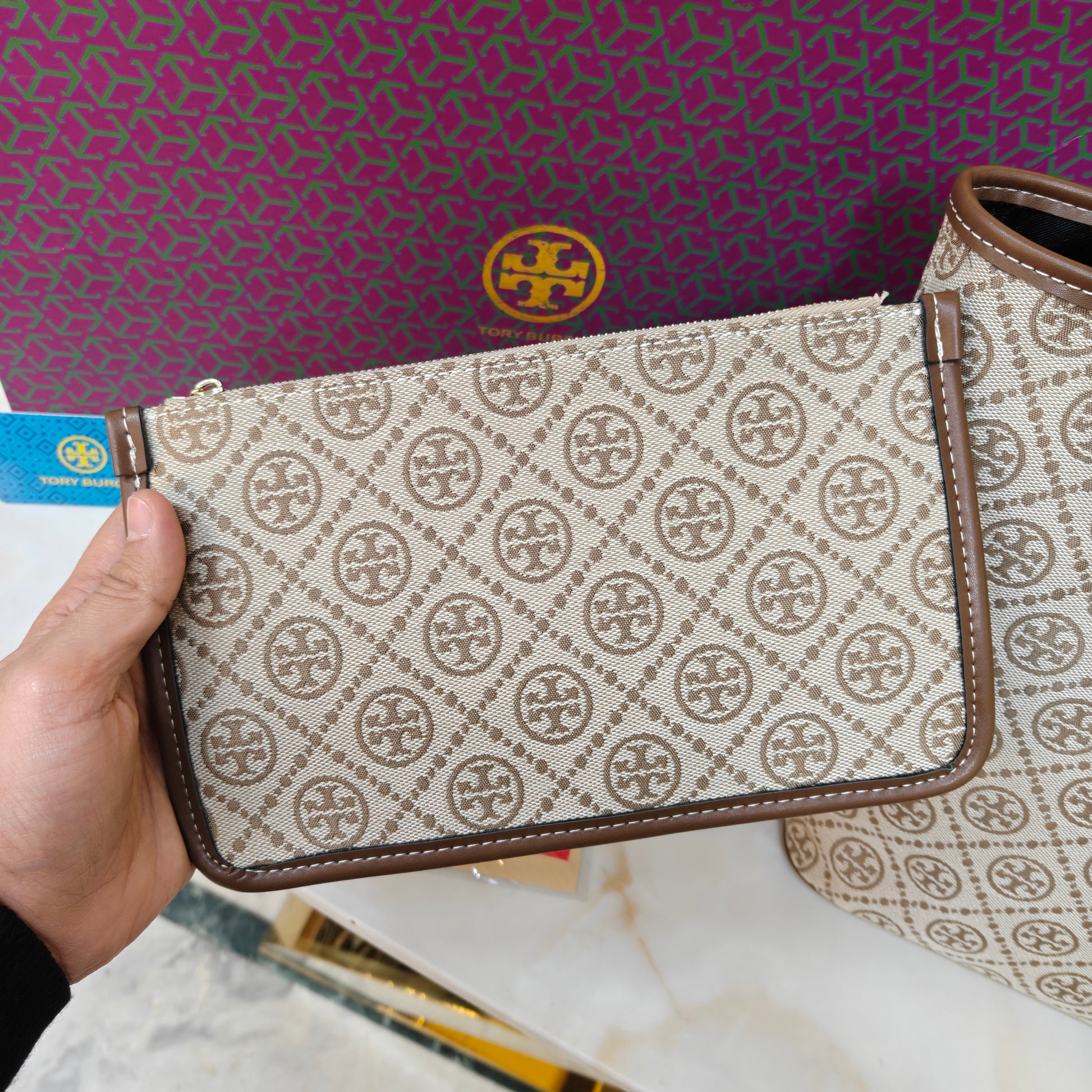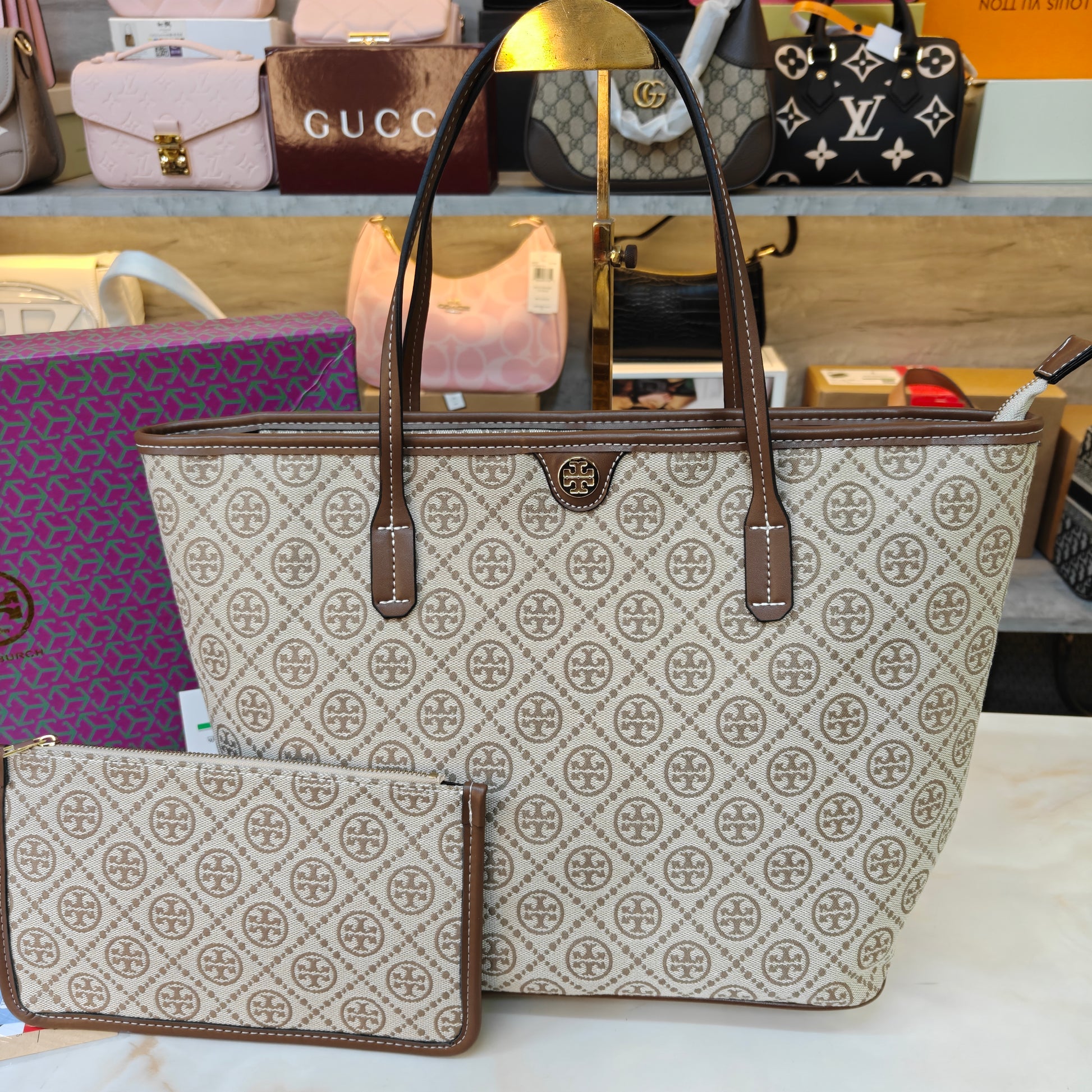 This stylish tote set features a spacious carryall crafted from durable jacquard-style canvas with an all-over geometric pattern. The structured silhouette is complemented by smooth leather straps and trim, giving it a polished and versatile look. Inside, the roomy interior easily fits daily essentials, making it perfect for work, travel, or everyday use. The set also includes a matching zip pouch that can be used for organization or carried on its own. A functional and fashionable choice for effortless elegance.