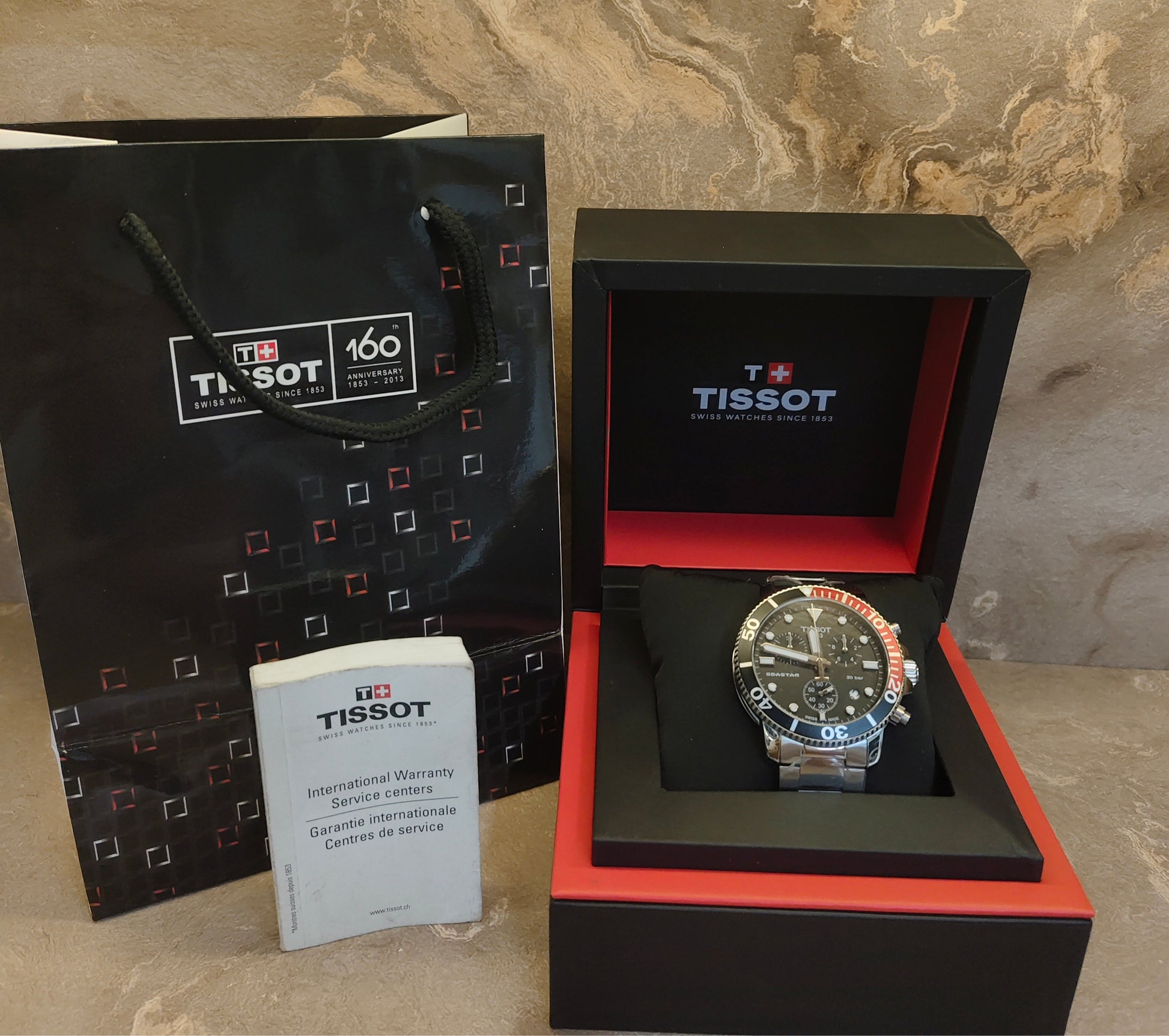 Stainless steel case with a stainless steel bracelet. Uni-directional rotating stainless steel bezel with an inlaid black and red aluminium ring. Black dial with luminous silver-tone hands and dot hour markers. Minute markers around the outer rim. Dial Type: Analog. Luminescent hands and markers. Date display between the 4 and 5 o'clock positions. Chronograph - three sub-dials displaying: 60 second, 30 minute and 1/10th of a second. Scratch resistant sapphire crystal. Screw down crown. Solid case back. Round case shape. Case size: 45.5 mm. Case thickness: 12.8 mm. Band width: 22 mm. Fold over clasp with a safety release. Water resistant at 300 meters / 1000 feet. Functions: chronograph, rattrapante, date, hour, minute, small second. T-sport Series. Dive watch style